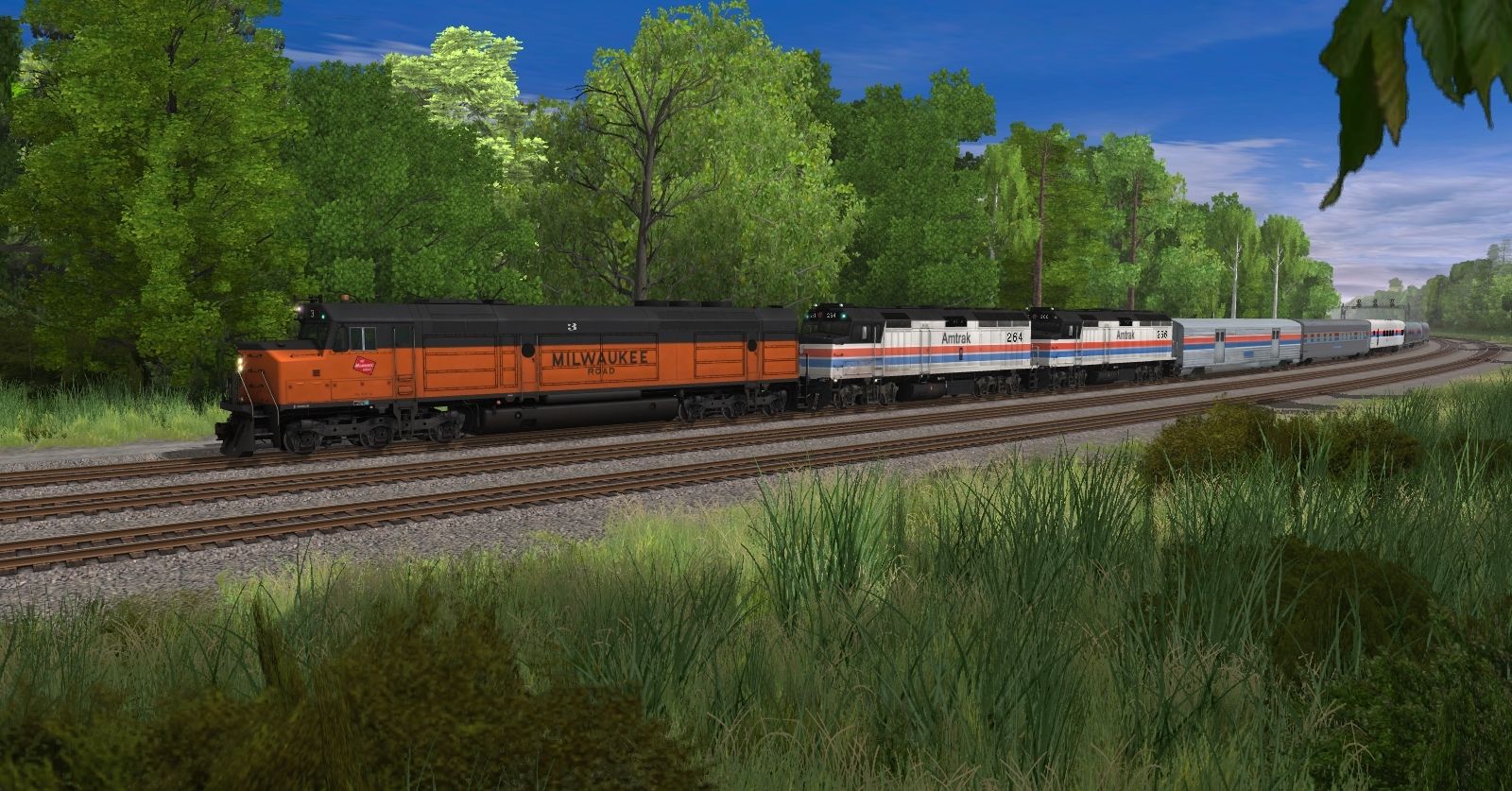 Tags: Trainz: A New Era, PRR Bradford Line, MILW FP45 Late Freight (Standard Bell), AMTK F40PH ph2 #264-269, Amtrak Budd baggage2 Phase II, AMTK PS106B Sleeper (Toronto Islands), AMTK Lightweight Le Pub Lounge Phase II, AMTK Amfleet Amcafe Phase I, AMTK Amfleet Amcoach Phase I, AMTK PS106B Sleeper (Toronto Harbour), AMTK Heritage 10-6 Grove Series Sleeper Phase III ex SP, AMTK Heritage 10-6 Pacific Series Sleeper Phase III ex UP, Invisible Train