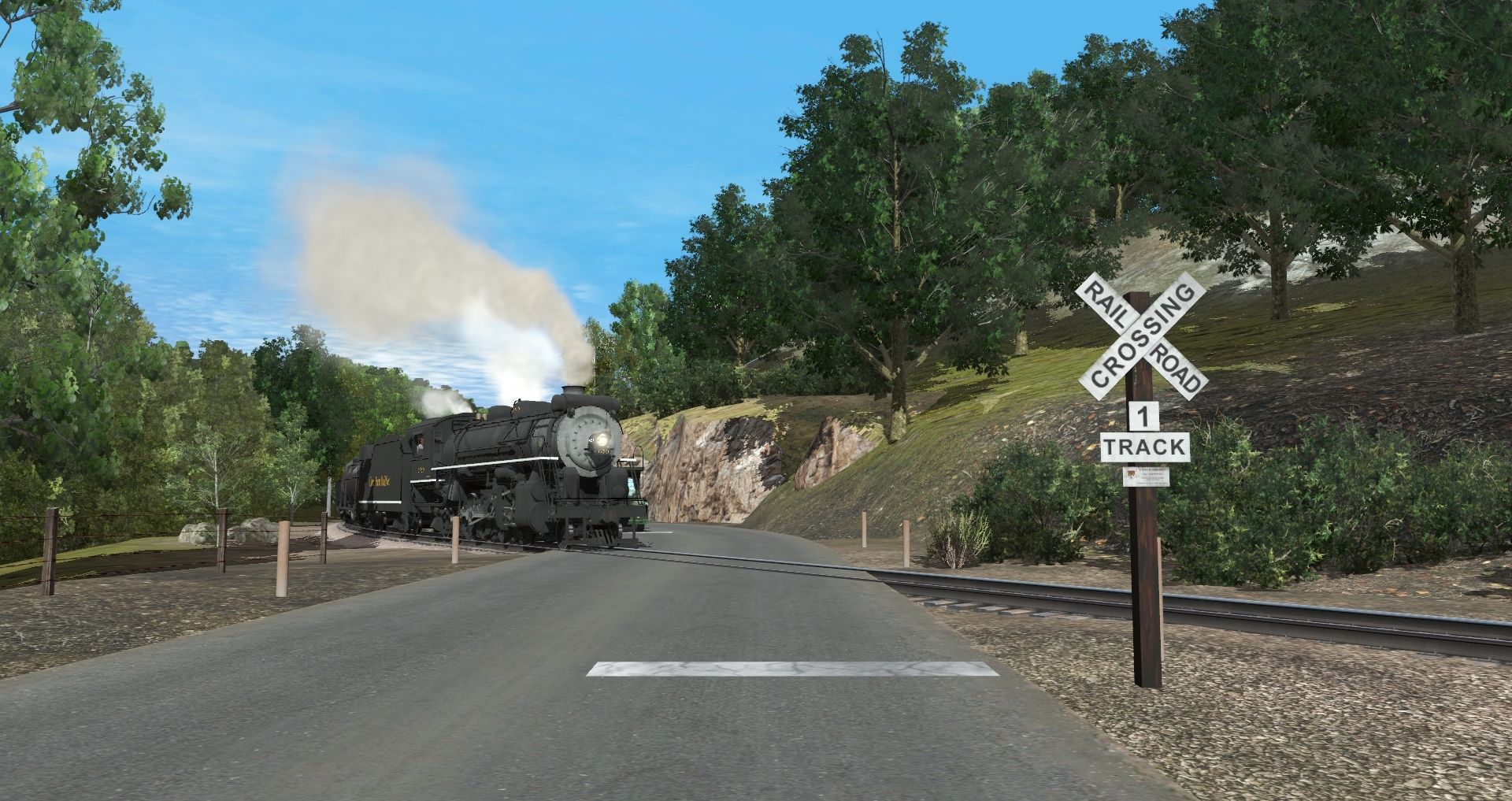 Tags: Trainz Railroad Simulator 2019, Coal Country, Default, CPR Mikado 2nd Versipn, CPR GP35 (HH), CPR SD35, CPR MS-1 Tender, 38' X-3 Tank Car DCWX, USRA C Gondola SOU, TTX F89F Flat 89 TOFC Fictional Trailer Train, CPR BE-1 Express Boxcar - Early, BCW&S Coast Daylight Baggage-Chair Car, BGKRR Lightweight Coach, ATL Coach Lounge