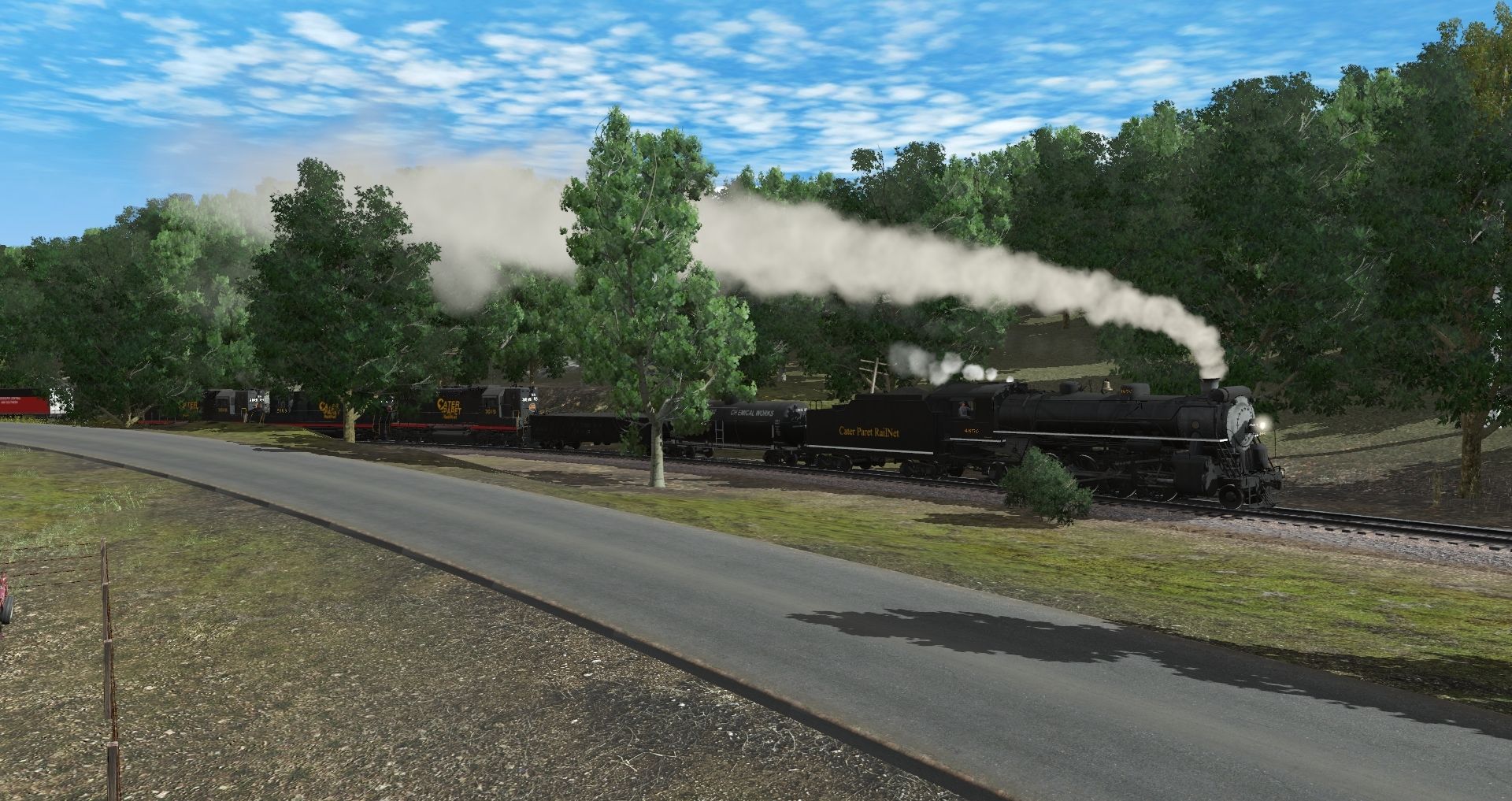 Tags: Trainz Railroad Simulator 2019, Coal Country, Default, CPR Mikado 2nd Versipn, CPR GP35 (HH), CPR SD35, CPR MS-1 Tender, 38' X-3 Tank Car DCWX, USRA C Gondola SOU, TTX F89F Flat 89 TOFC Fictional Trailer Train, CPR BE-1 Express Boxcar - Early, BCW&S Coast Daylight Baggage-Chair Car, BGKRR Lightweight Coach, ATL Coach Lounge