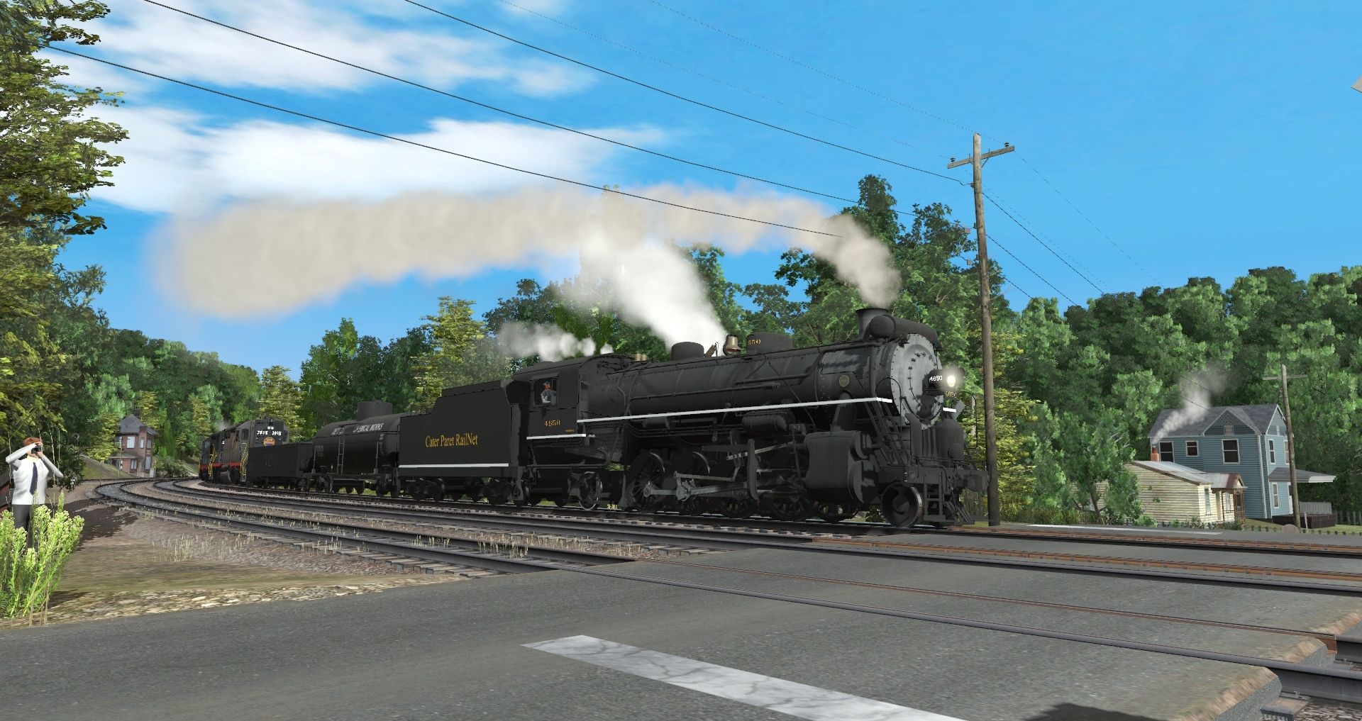 Tags: Trainz Railroad Simulator 2019, Coal Country, Default, CPR Mikado 2nd Versipn, CPR GP35 (HH), CPR SD35, CPR MS-1 Tender, 38' X-3 Tank Car DCWX, USRA C Gondola SOU, TTX F89F Flat 89 TOFC Fictional Trailer Train, CPR BE-1 Express Boxcar - Early, BCW&S Coast Daylight Baggage-Chair Car, BGKRR Lightweight Coach, ATL Coach Lounge