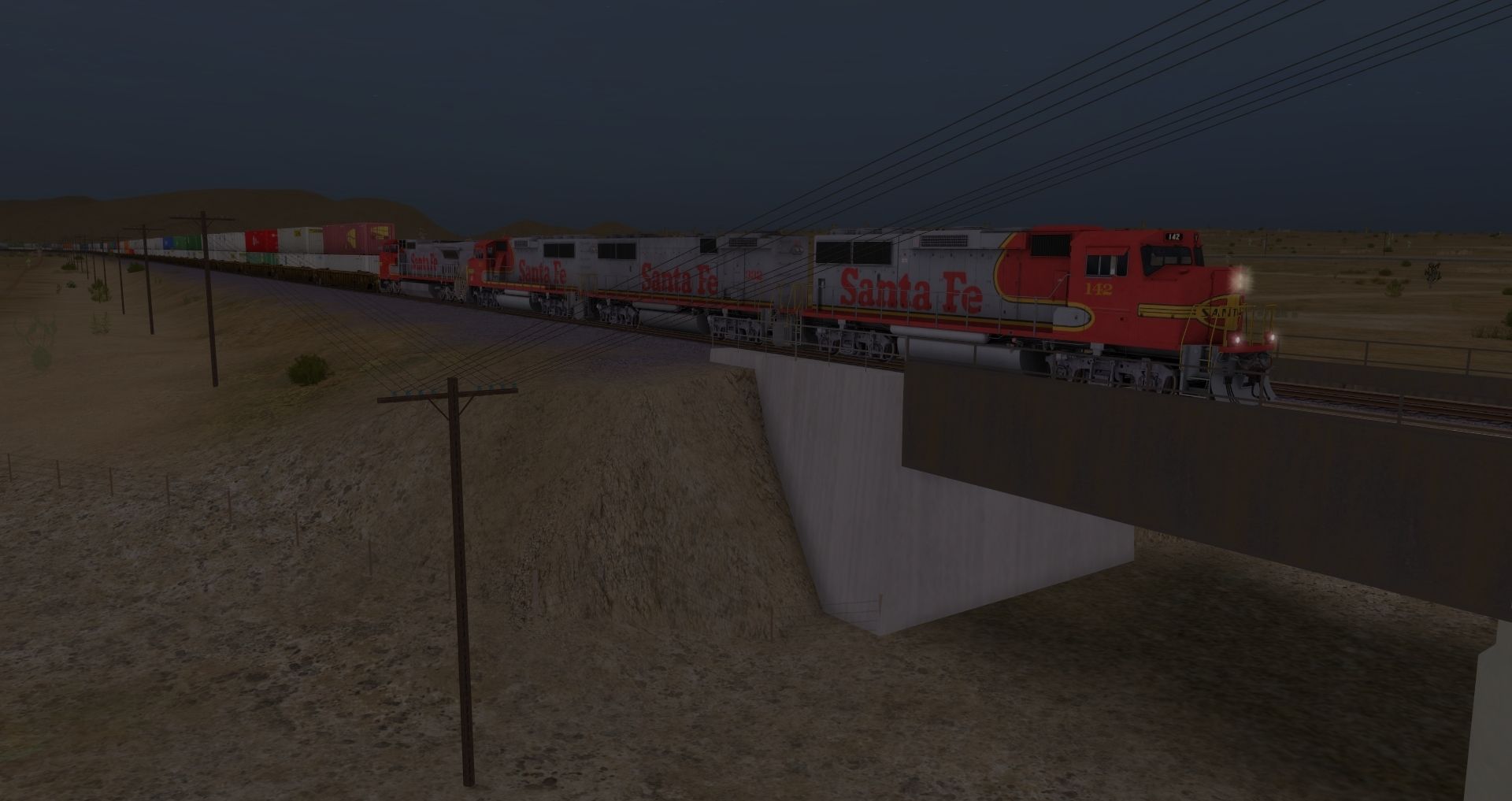 Posted by: Dashboy22 | Posted:2022-07-12 14:53:16 Caption: Tags: Trainz: A New Era, Mojave Sub Division, ATSF GP60M, ATSF GP60B, ATSF C40-8W, TTX NSC 53 Double stack Well