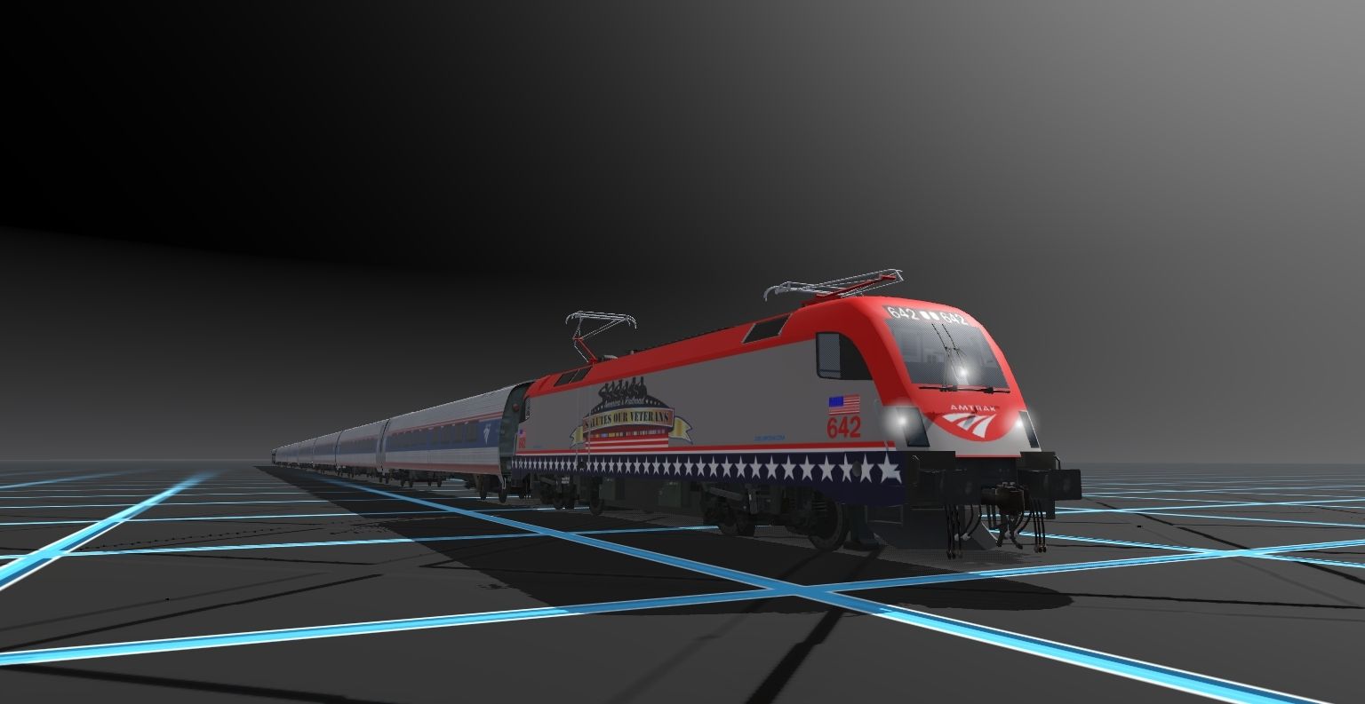 Tags: Trainz Railroad Simulator 2019, Retro Digital Landscape, Default, Amtrak ACS-64 642 VETERANS, Amtrak Amfleet Coach V (with added bogie sounds), Amtrak Amfleet Cafe V (Northeast Regional with added bogie sounds), Horizon Fleet Coach AmtrakDES