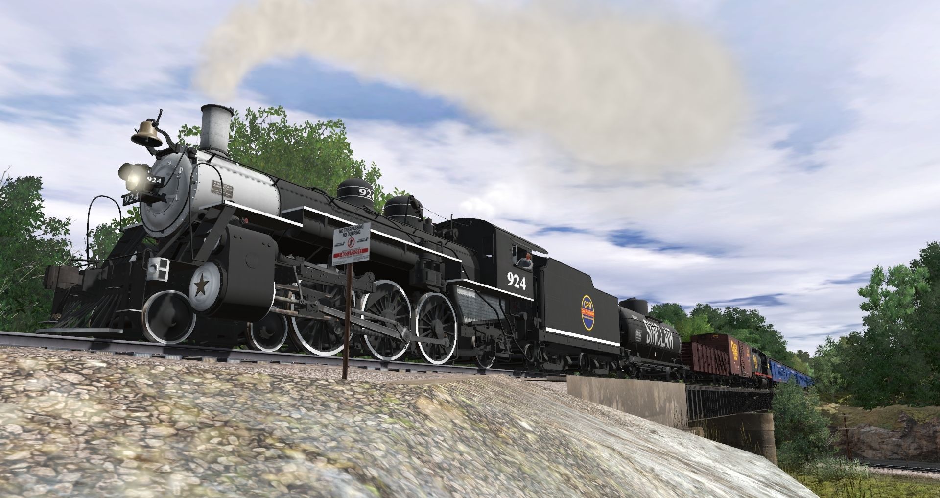 Tags: Trainz Railroad Simulator 2019, Coal Country, Default, CPR 4-6-2 924 Mexico Years, CPR GP38-2 ph1, CPR 924 Mexico Tender, 38' X-3 Tank Car Sinclair, USRA C Gondola C&A, 40ft Boxcar CPR, CPR B Railway Post Office, CPR B Baggage-Buffet-Lounge V1, CPR B Sleeper 14 Section V1, CPR B Sleeper 10-2 V1, CPR B Dining Car