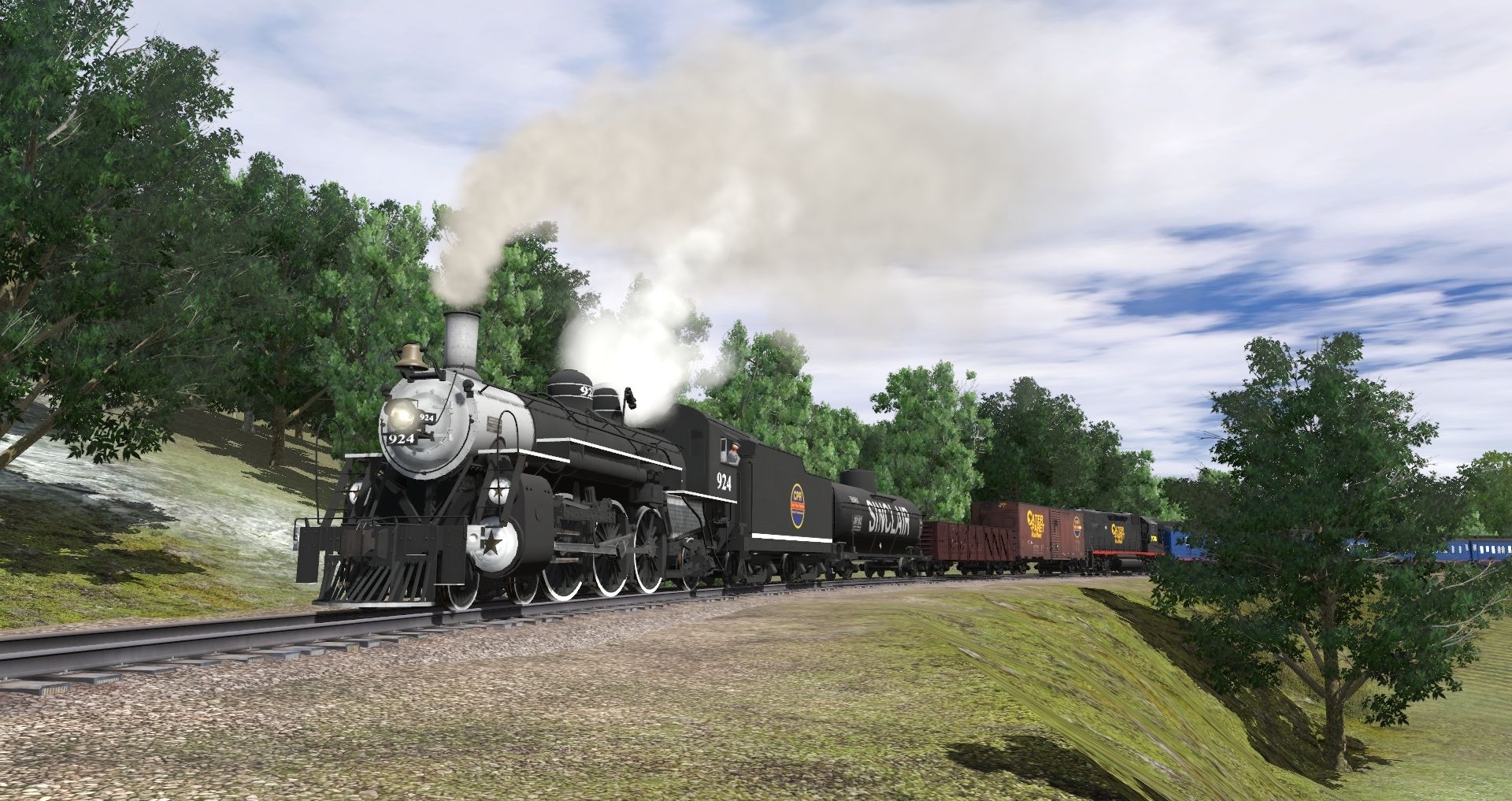 Tags: Trainz Railroad Simulator 2019, Coal Country, Default, CPR 4-6-2 924 Mexico Years, CPR GP38-2 ph1, CPR 924 Mexico Tender, 38' X-3 Tank Car Sinclair, USRA C Gondola C&A, 40ft Boxcar CPR, CPR B Railway Post Office, CPR B Baggage-Buffet-Lounge V1, CPR B Sleeper 14 Section V1, CPR B Sleeper 10-2 V1, CPR B Dining Car