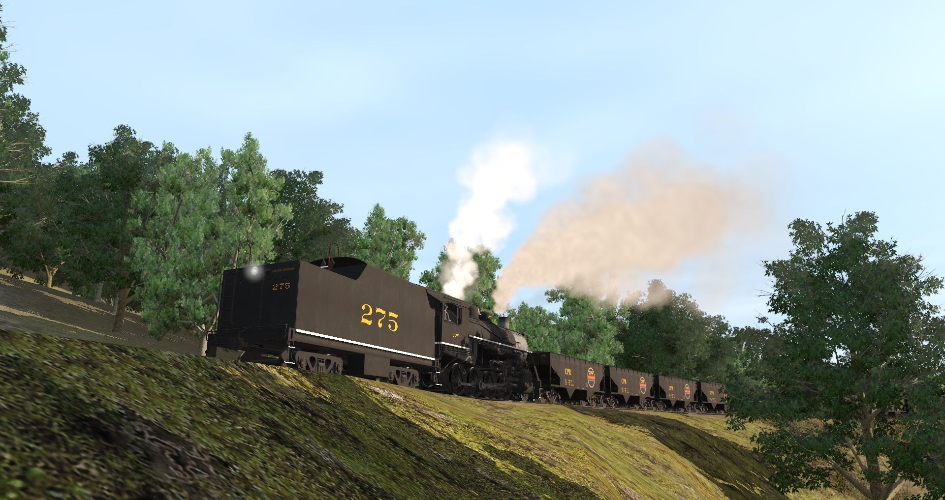 Tags: Trainz Railroad Simulator 2019, Coal Country, Default, CPR 275, CPR 4-6-2 924 Mexico Years, CPR GP38-2 ph1, CPR 275 Tender, CPR 55 Ton Hopper, CPR Red Caboose, CPR 924 Mexico Tender, 38' X-3 Tank Car Sinclair, USRA C Gondola C&A, 40ft Boxcar CPR, CPR B Railway Post Office