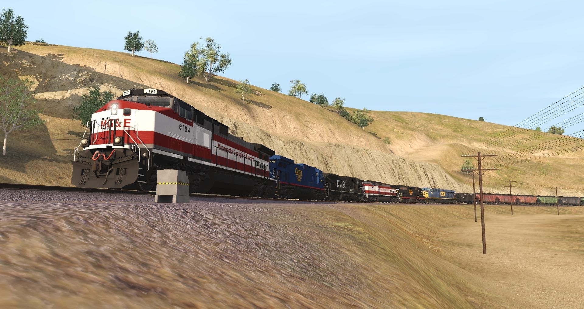 Tags: Trainz Railroad Simulator 2019, Mojave Sub Division, Default, CPR B C45-9 HH, KWSC C40-9 hh, MG&E C45-9W, CPR GP40-2, CSX ES44DC, SOU 100 Ton Hopper, RPPX 100 Ton Hopper