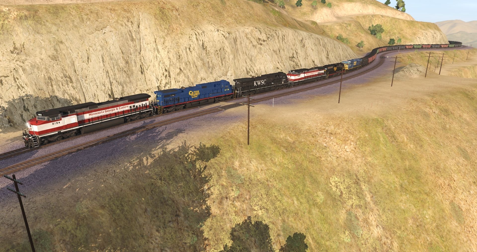 Tags: Trainz Railroad Simulator 2019, Mojave Sub Division, Default, CPR B C45-9 HH, KWSC C40-9 hh, MG&E C45-9W, CPR GP40-2, CSX ES44DC, SOU 100 Ton Hopper, RPPX 100 Ton Hopper