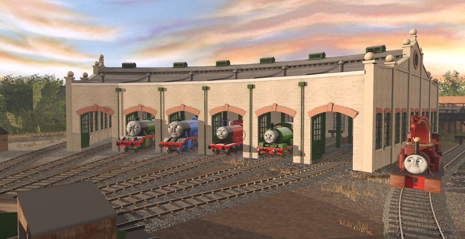 Tags: Trainz Railroad Simulator 2019, Hit Era - Tidmouth Sheds Sunset, Hit Era - Tidmouth Sheds Sunset - Default, TTTE - Thomas The Tank Engine, TSI - Edward The Blue Engine, Harvey The Crane Engine, TSI - Edward's Tender, SudrianRails - Percy the Small Engine, TTTE - James the red engine, TSI - Gordon The Big Engine, SudrianRails - Henry the Green Engine (New Shape), TSI - Gordon's Tender, SudrianRails - Henry's Tender, TTTE - James's Tender (Reskin Friendly)