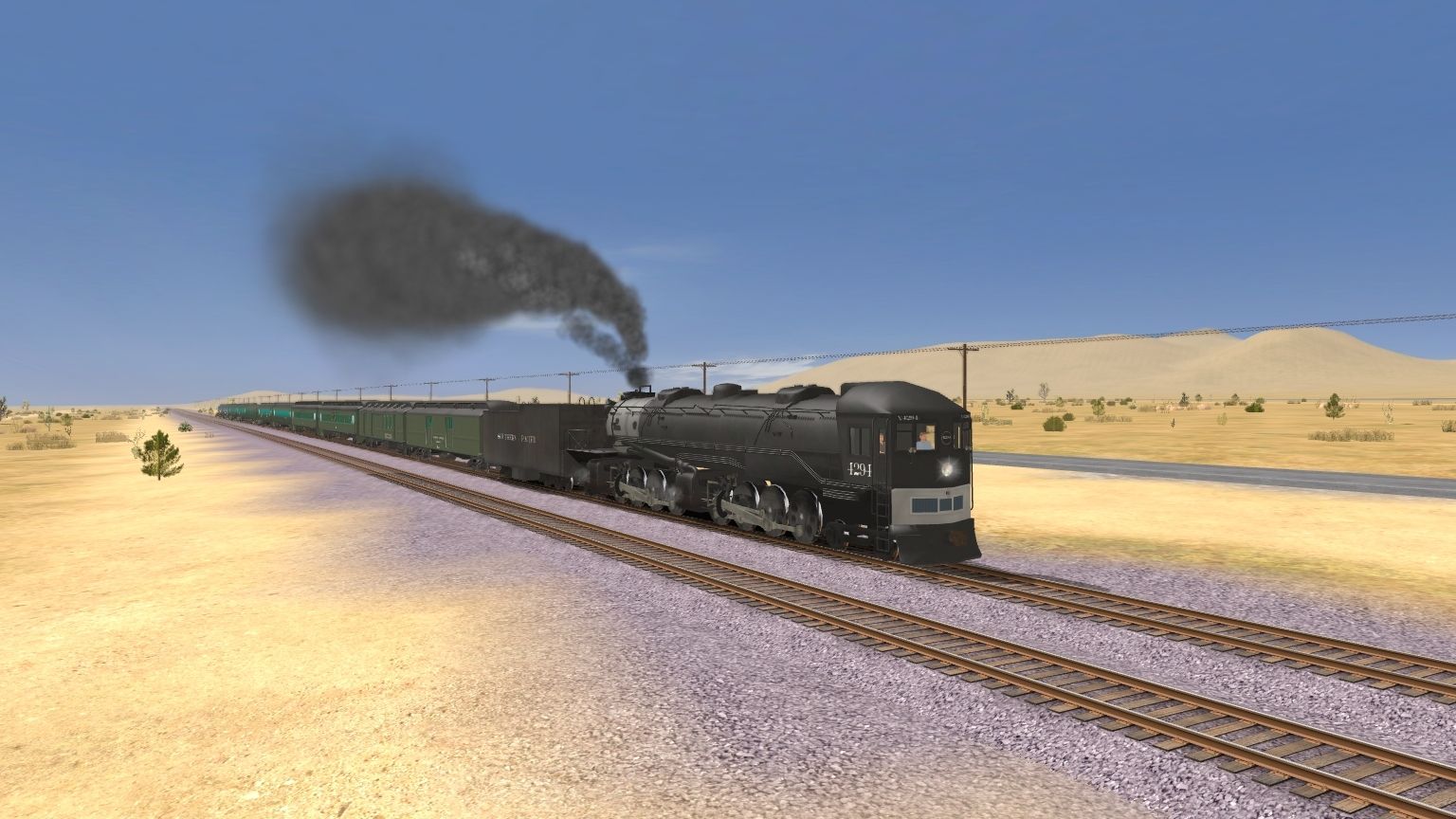 Tags: Trainz: A New Era, Mojave Sub Division, Steam Age, SP Cab Forward, SP Cab Forward Tender, Unlettered Pullman Baggage-Express Car, Unlettered Pullman Style RPO-Baggage Combine, Unlettered Pullman Coach, Unlettered Pullman Diner, Unlettered Pullman Smoker, Unlettered Pullman Style Coach