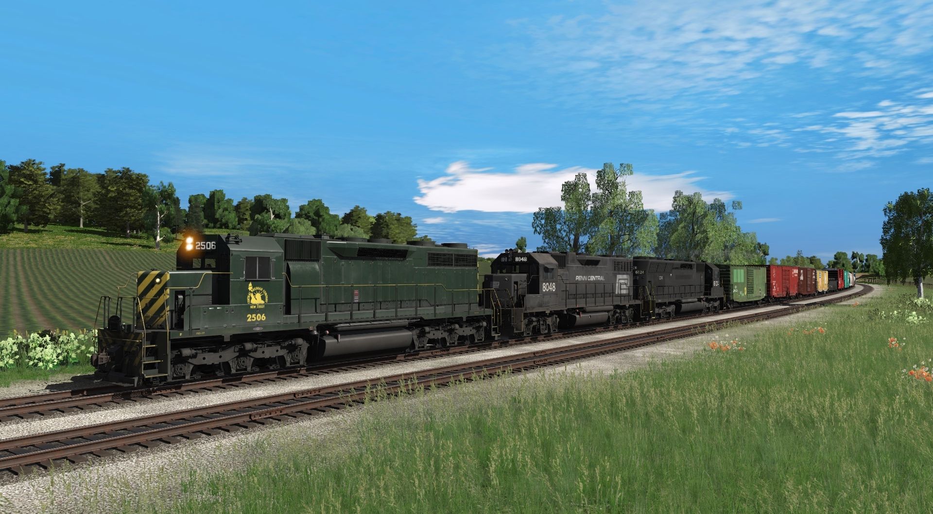 Tags: Trainz Railroad Simulator 2019, Indiana Western 1970s TS19 1.0, Flying Cam, CNJ SD35, PC GP38-2, CR SD45 PC Patch, CR 50' PS-1 BR50L (RDG Patch), MKT 60' ACF Boxcar DD, 50ft Boxcar Seaboard Coast Line Rail Road Co yt#, UP 50' B-70-6 [1970s] (Autoparts), NW G72 Gondola, ATSF 50' PC&F 6033 Bx-127 (1970s), PC 60' X61/X61C Boxcar