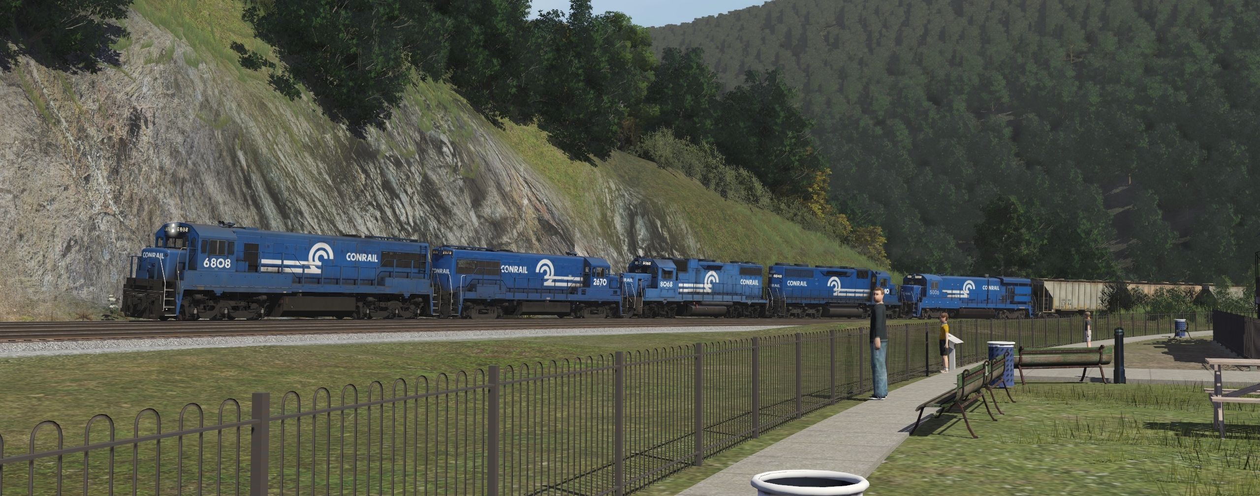 Tags: Trainz Railroad Simulator 2022, NS Horseshoe Curve, Default, GT GP9 black, CR ex-PRR U25C ph3a, CR ex-NH U25B ph4, CR GP38-2 (Early), CR SD35, CR B36-7 ph3d early 5000-5015, GECX C30-S7 #3000, GECX C30-S7 #3001, PRR FM flat car, CRGX Trinity 3 Bay Hopper, CRDX 2 bay Trinity hopper wheathered 1