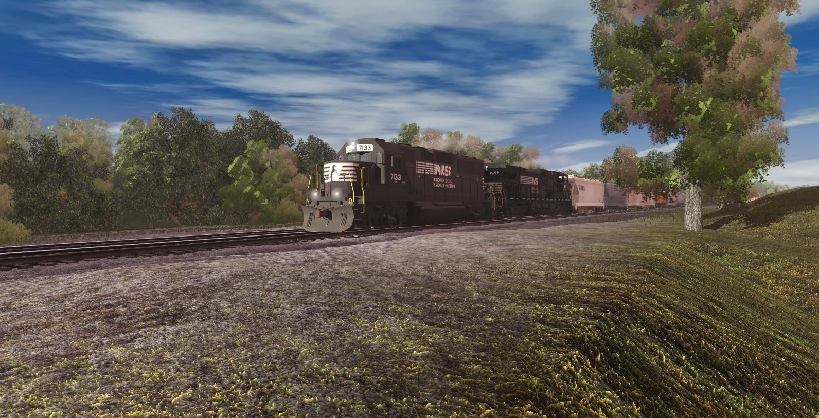 Tags: Trainz Railroad Simulator 2019, Norfolk Southern Opeya District, EMD GP60 NS #7133, NS C40-9W, NS Centerflow Hopper #244310, NS Centerflow Hopper #850149, NS Centerflow Hopper #840886, NS Centerflow Hopper #291366, LR AOK 181980, JRPX ACF Centerflow 4 Bay, JRPX LO 4750 3 bay, NDYX 475227 Trinity 3 Bay Hopper, Centerbeam FleXibeam™ Hybrid BNSF green DES