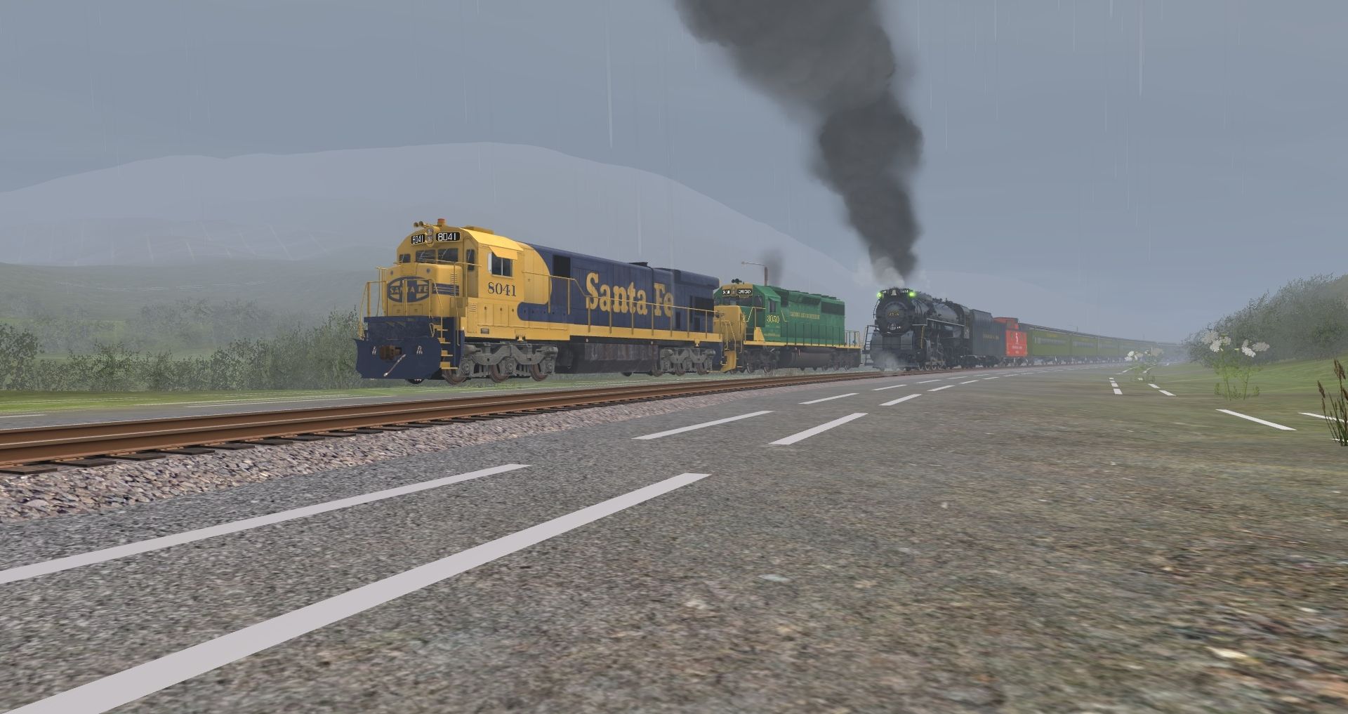 Tags: Trainz: A New Era, READING & NORTHERN, Default, ATSF C30-7, C&O Kanawha K-4 Steam, RBMN SD50, SP SD45, RBMN SD40-2, C&O Kanawha K-4 Tender, Caboose C&O 90212 red, Coach C&O George Washington 735, Combine C&O George Washington, Express C&O George Washington, Pullman Paul A Bert
