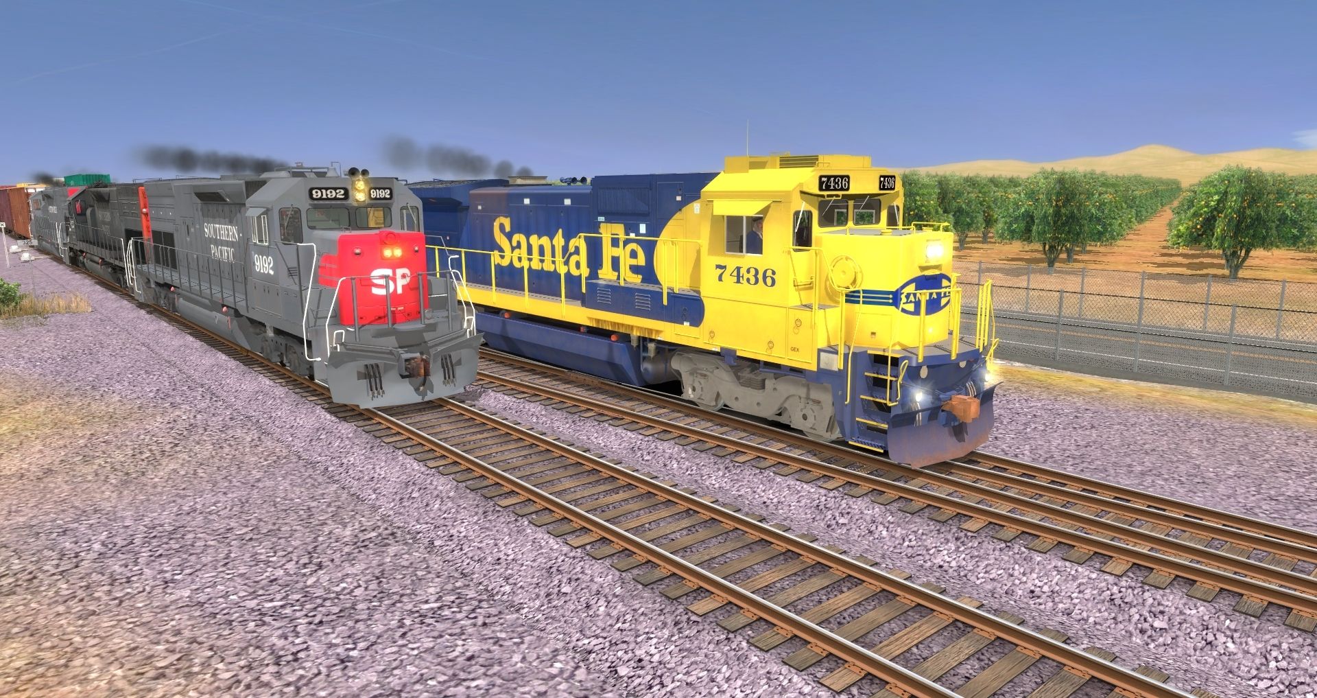 Tags: Trainz: A New Era, Mojave Sub Division, ATSF B40-8, SP SD45T-2 #9192, ATSF SD45, SP SD40T-2, ATSF FB FP45, SSW SD45T-2 #9375, SBD GP38-2 ex-L&N 4100-4144, ATSF SD40-2 #5190, ATSF SD40-2 #5022, TTX 53 Husky Stack, SP 60Ft.9In. woodchip gondola