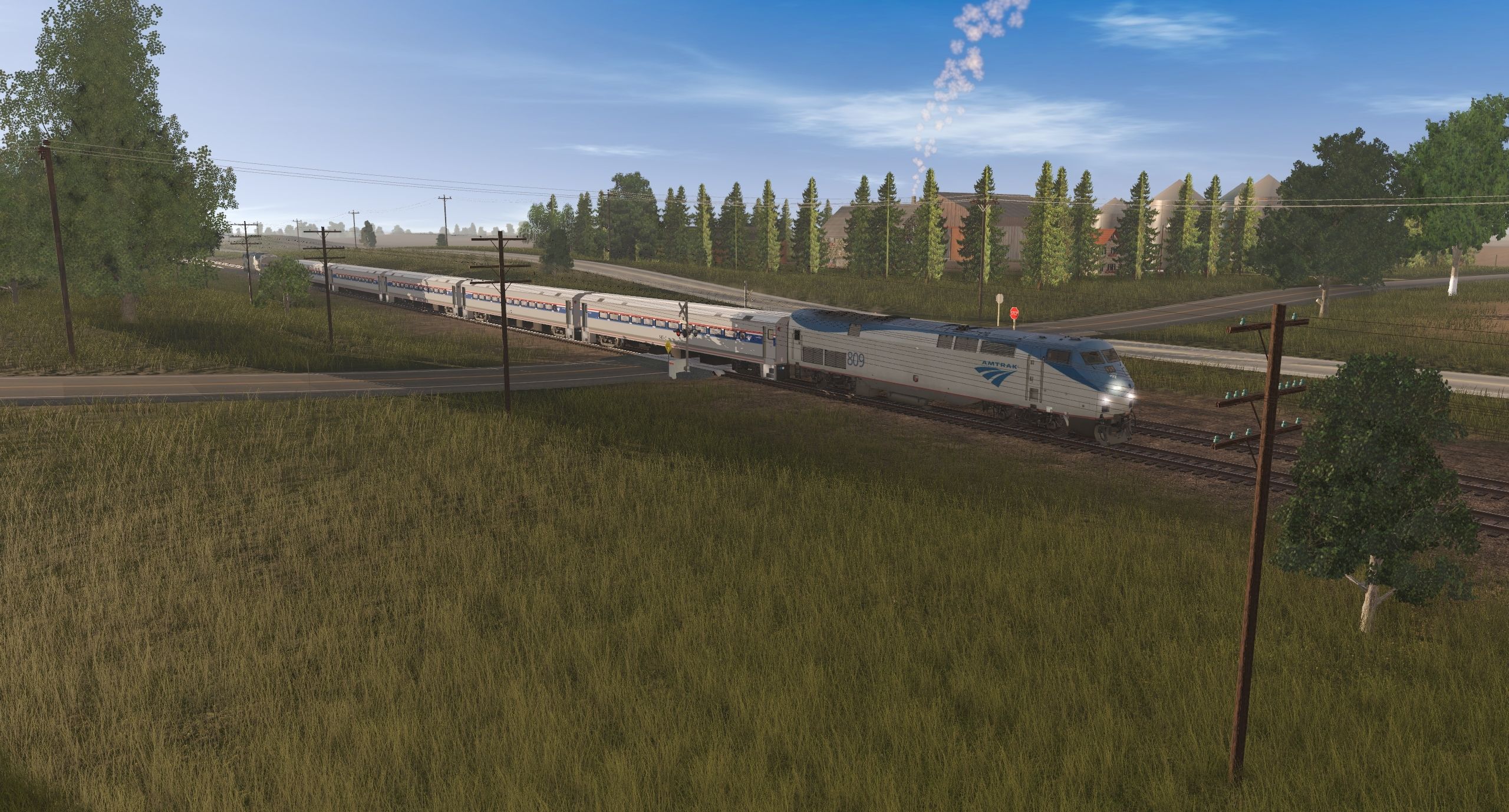 Caption: An amtrak train going past a crossing.