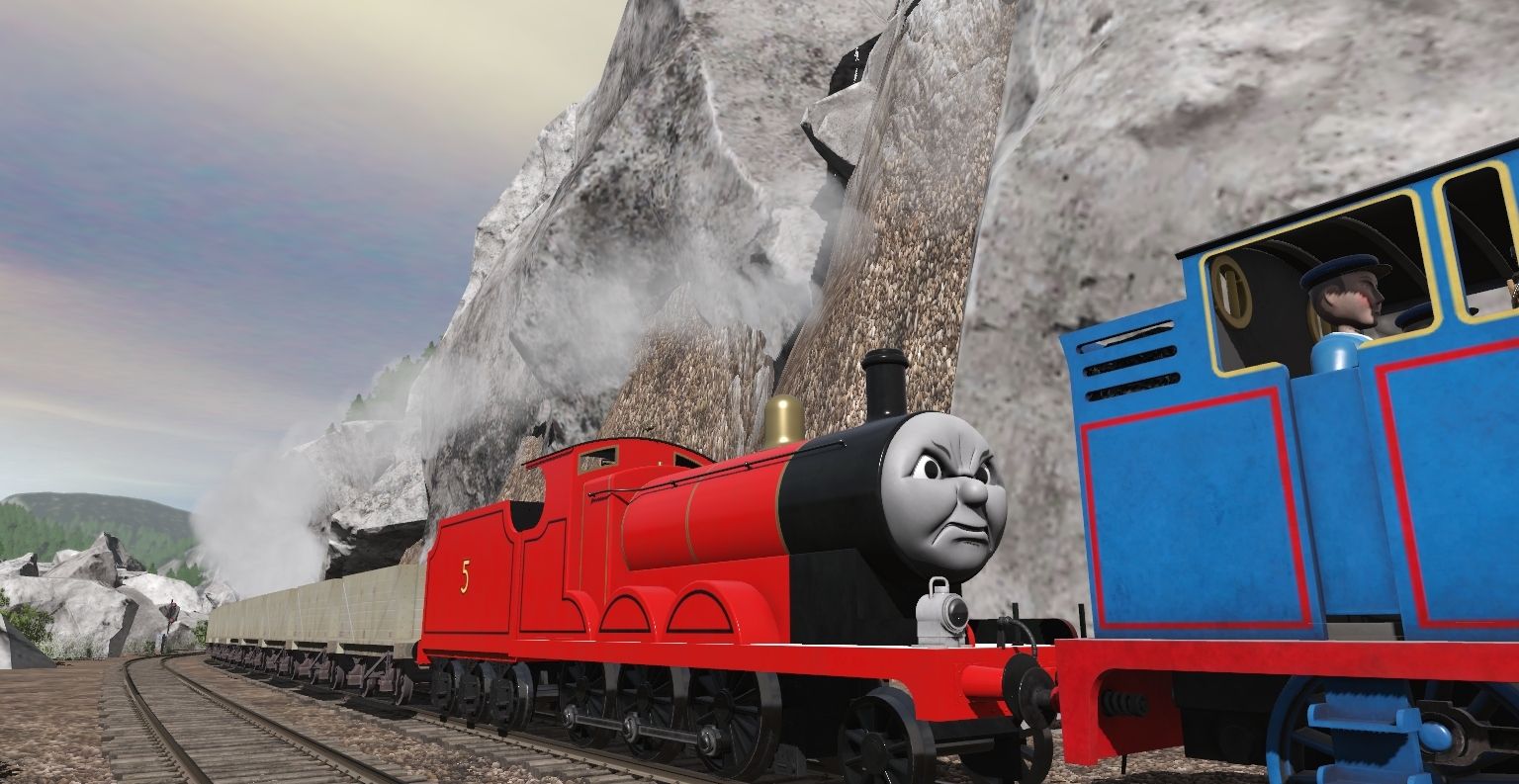 Tags: Trainz Railroad Simulator 2019, Canadian Rocky Mountains - Golden BC, TTTE - Thomas The Tank Engine [TRS19], TTTE - James the red engine (Reskin Friendly), TTTE - James's Tender (Reskin Friendly), BR 7 Plank wagon M162458 weathered, SR brake van