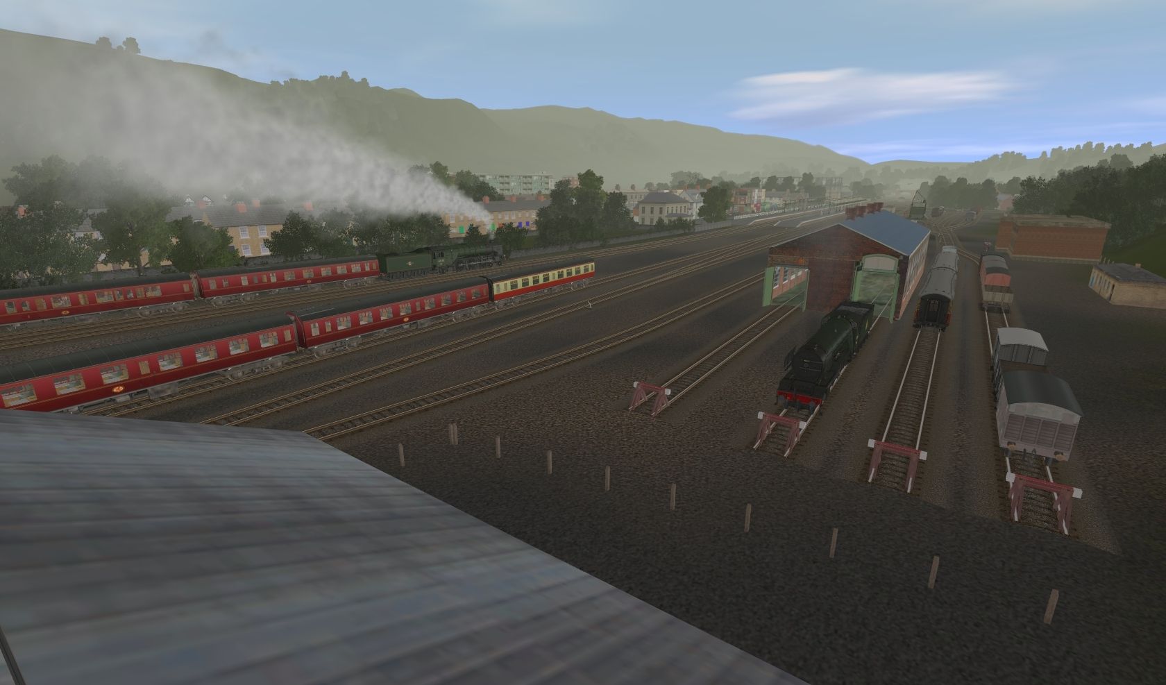 Tags: Trainz: A New Era, Rosworth Vale - LNER (Rev.1), BR Steam, BR Gresley A3 LHD Green Double Chimney Smoke Deflectors, LNER A1 60130 Kestrel (Shedplate), BR 9f Double Chimney, LNER N5 69310, GCR Fish Van-V2, GCR Wagon 7 Plank RCH, BR Mk1 TSO Maroon, BR Mk1 BCK Maroon, GCR Wagon 10 Ton Fitted Van Cupboard Doors, BR Gresley A3 Tender - GN Coal Rail Green Early Crest, BR Mk1 SK Carmine