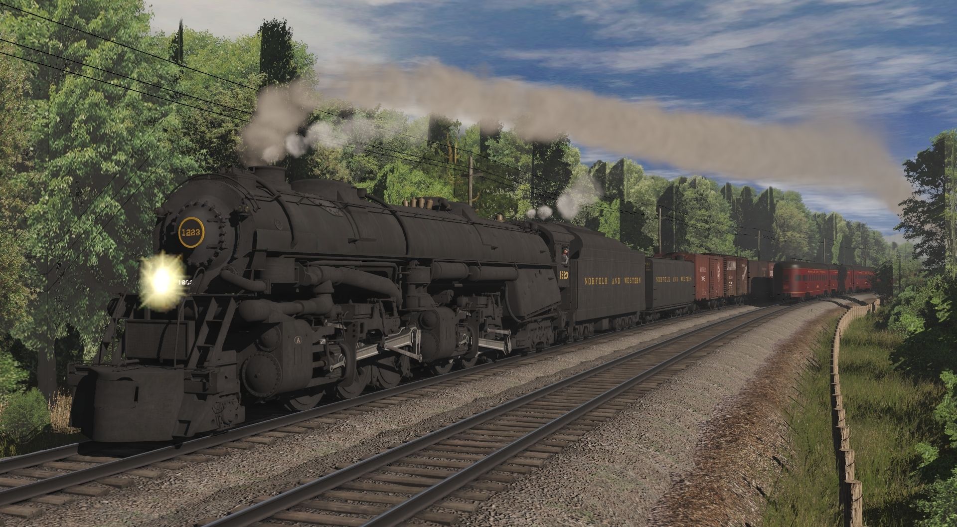 Tags: Trainz Railroad Simulator 2022, Eastern Mountain Route, Default, Flying Cam, N&W A Class Engine V1, N&W J Class Engine, N&W A Class Tender, N&W A Class Aux Tender, 40ft Boxcar SOU, 40ft Boxcar DL&W Late Weathered, 40ft Boxcar C&O, N&W Powhatan Arrow 07 P4 Observation Lounge 582, 40ft Boxcar SAL, 40ft Boxcar B&O Wagontop Postwar Flat Doors