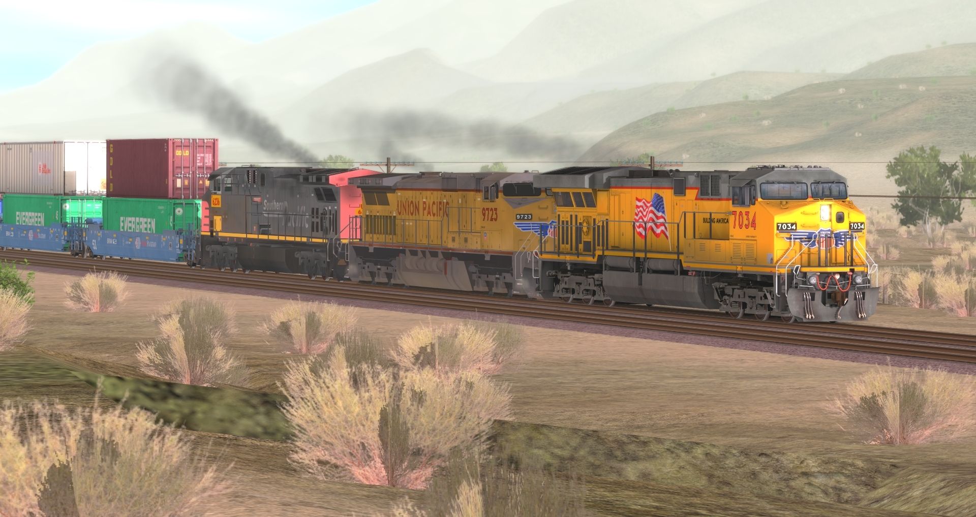 Tags: Trainz: A New Era, Cajon Subdivision - 1990 Part 1: The Pass, Flying Cam, UP C44ACM, UP C44-9W Lightning Stripe, UP AC4400CW #6236 ex-SP Patched, 53ft Pacer Wellcar Weathered (Single), 53ft Pacer Wellcar (Single), 53ft DTTX Wellcar Weathered (Single), 53ft DTTX Wellcar (Single), 53ft BNSF H3 Wellcar Weathered (Single), 53ft BNSF H3 Wellcar (Single), Invisible Train