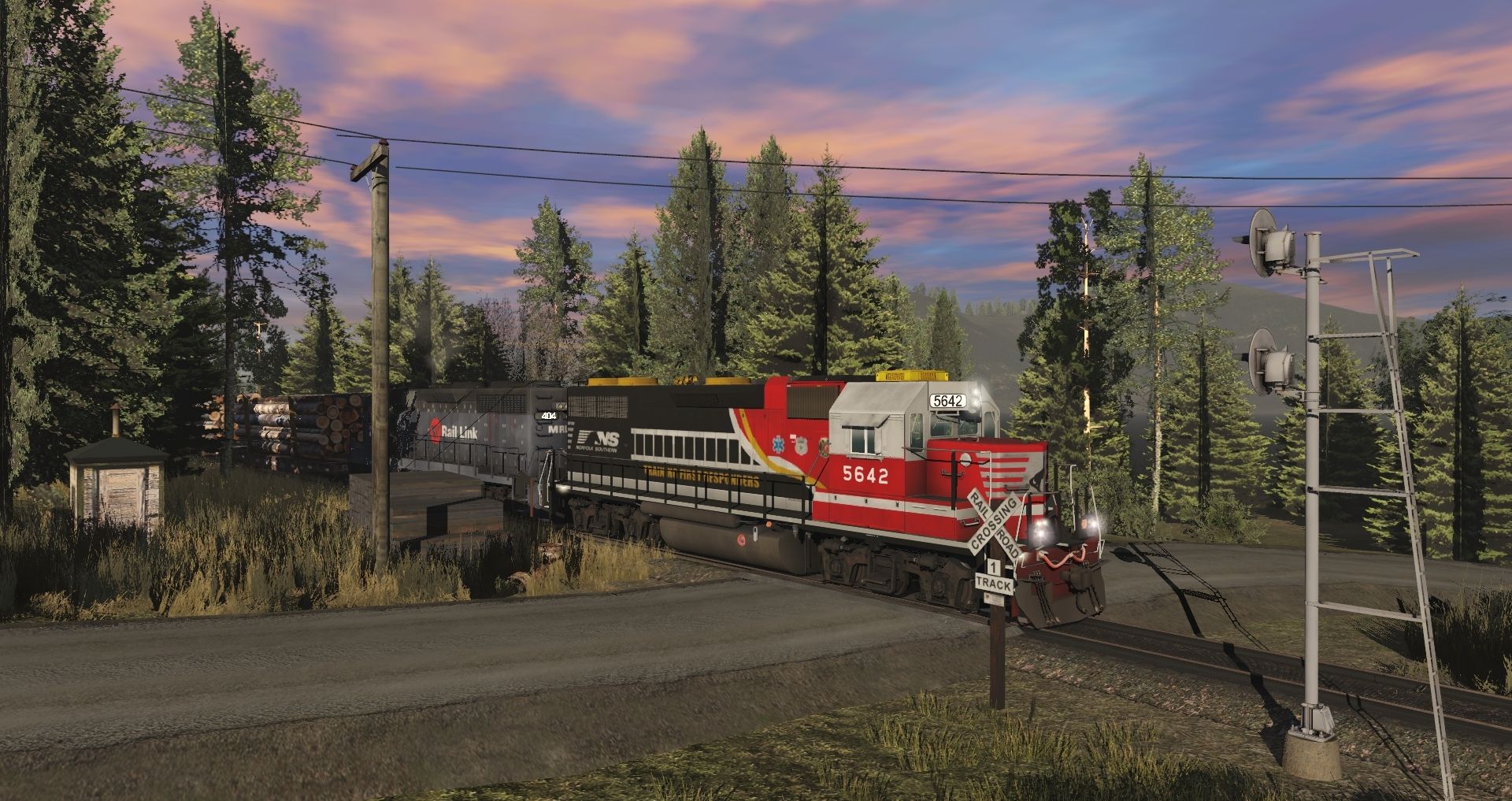 Tags: Trainz Railroad Simulator 2019, Eagle River Railway b., 01 Monday - 14:57 21/05/2022 - 00:19:01, NS 5642 GP38-3, MRL GP35 Rail Link Logo, BN SD9 (ex-GN) PHIII #6121, CC&W SD9M #58, ERSX 54ft flatcar, Caboose (Wide Vision) - RP&P, SVLX Log Rack