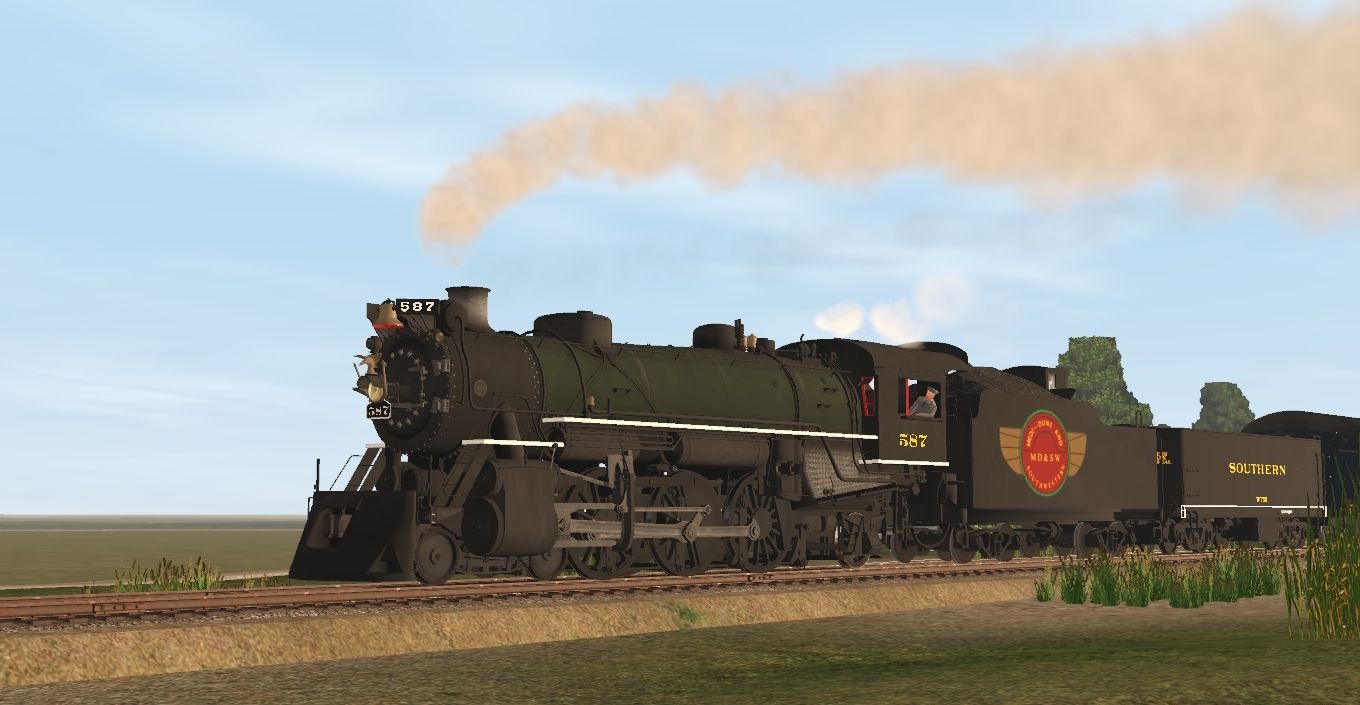 Tags: Trainz Railroad Simulator 2019, Southern Pacific Elkhorn Slough Module, Southern 587 Kitbash (Green Boiler Jacket And Darker Smokebox), Southern 587 Tender V2, Southern Aux Tender WT52, NKP Mikado 587 Tool Car Blue, NKP Mikado 587 Tool Car PRR