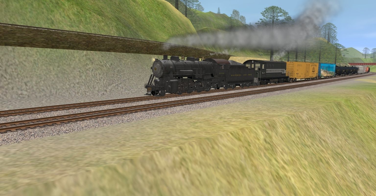 Tags: Trainz: A New Era, KS&W Main Yard 2, B&O E27 Engine, Fairbanks Morse H12-44 Locomotive NYC, B&O E27 Tender, Custom 60' ACF Boxcar - Sam & Euan's, Custom 60' ACF Boxcar - San Luis Obispo, UTLX 23000 gal Funnel-Flow tank car, JRPX ACF Centerflow 4 Bay round hatch, CN 52' Hopper, CNWX Cylindrical Hopper, CR 3bay Hopper 433216 (H39B), CR 3bay Hopper 458421 (H39B)