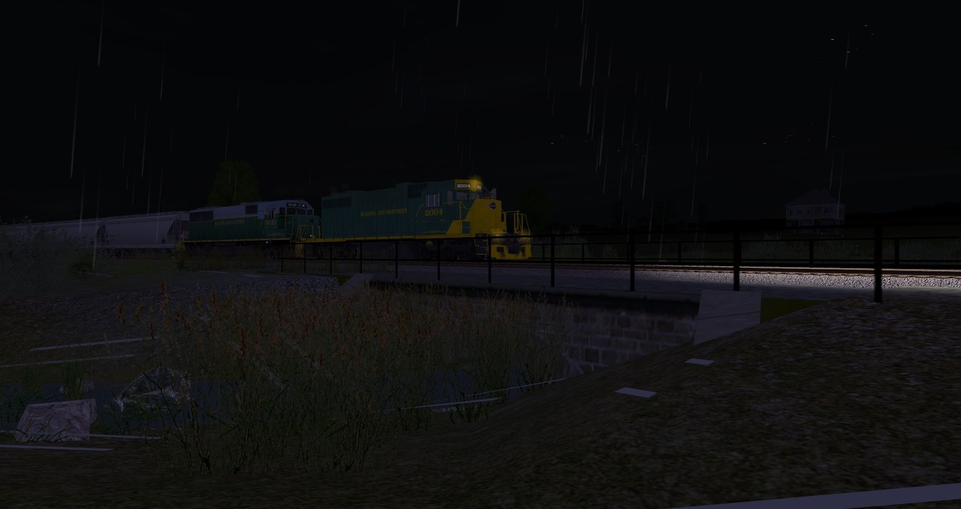 Tags: Trainz: A New Era, READING & NORTHERN, Default, SD38 RBMN #2004, RBMN SD50, JRPX ACF Centerflow 4 Bay round hatch, Custom ACF 3 Bay - Winchester & Western, MWGX (dirty) Cylindrical Hopper, NS 60ft Boxcar PS (Autoparts)