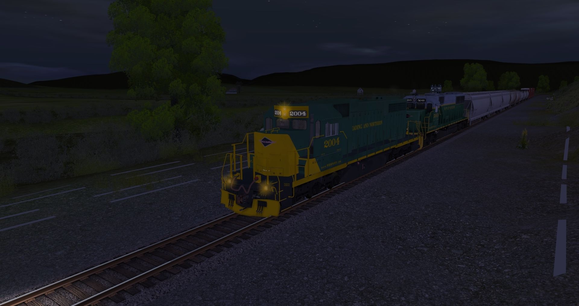 Tags: Trainz: A New Era, READING & NORTHERN, Default, SD38 RBMN #2004, RBMN SD50, JRPX ACF Centerflow 4 Bay round hatch, Custom ACF 3 Bay - Winchester & Western, MWGX (dirty) Cylindrical Hopper, NS 60ft Boxcar PS (Autoparts)