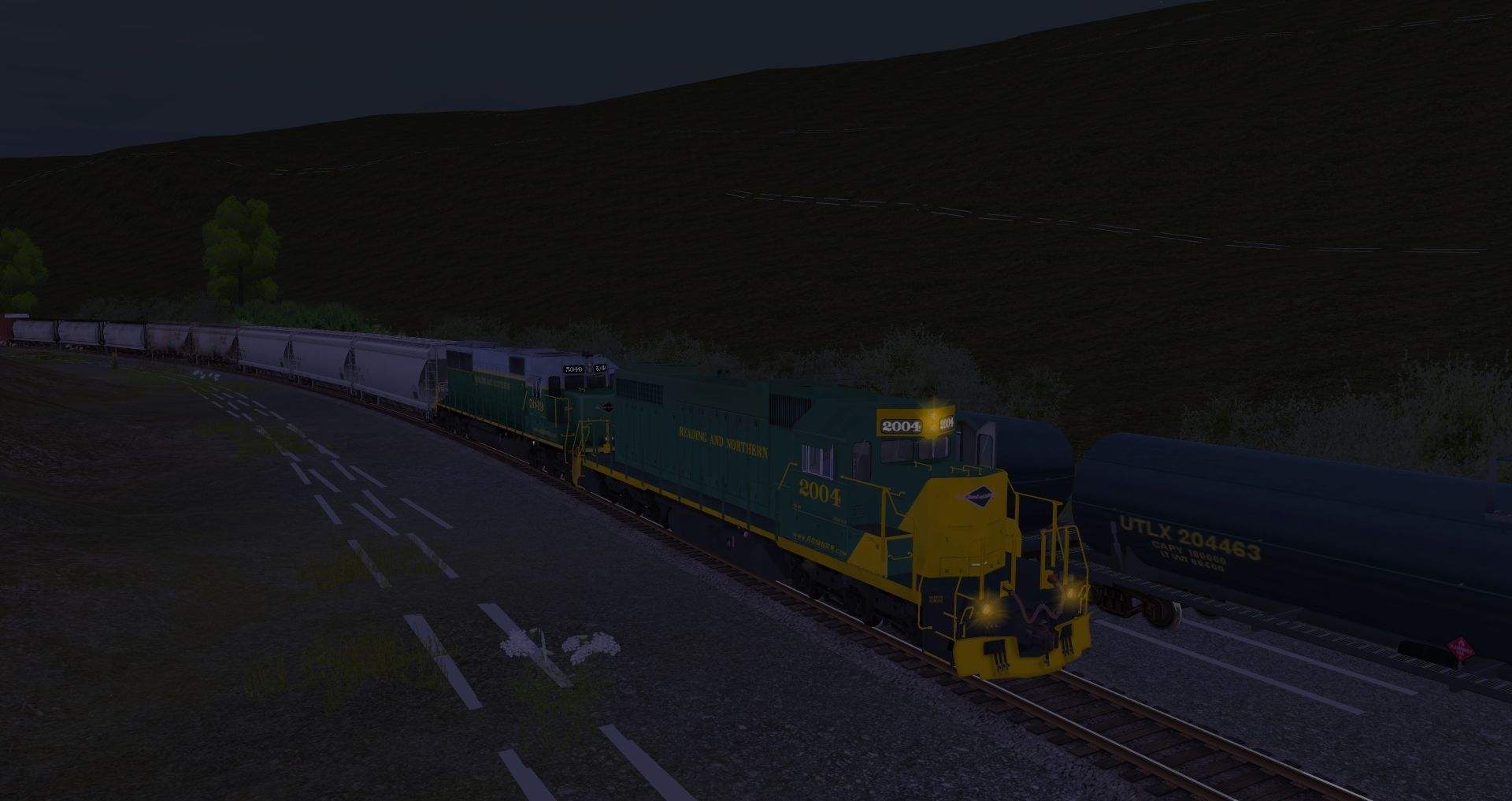 Tags: Trainz: A New Era, READING & NORTHERN, Default, SD38 RBMN #2004, RBMN SD50, JRPX ACF Centerflow 4 Bay round hatch, Custom ACF 3 Bay - Winchester & Western, MWGX (dirty) Cylindrical Hopper, NS 60ft Boxcar PS (Autoparts), Oil Tanker UTLX 60 Ft