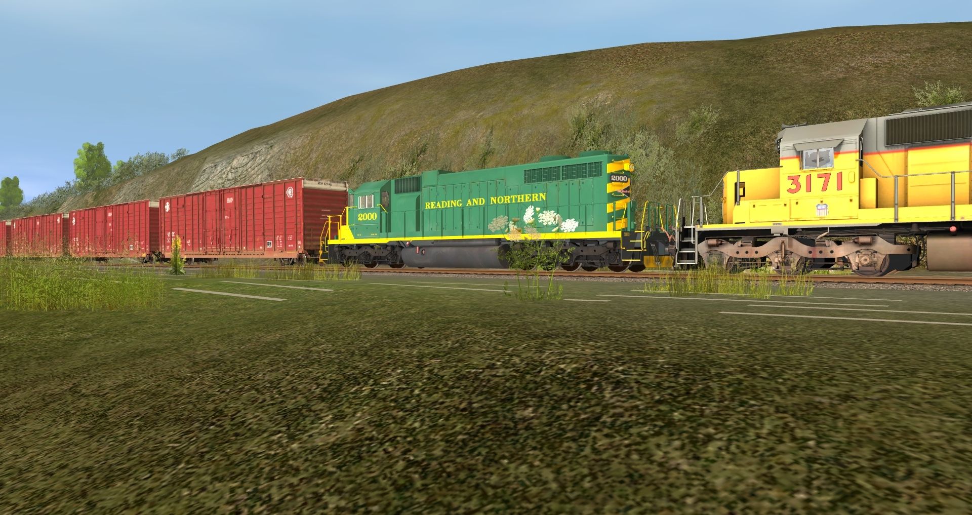 Tags: Trainz: A New Era, READING & NORTHERN, Default, UP SD40-2, SD38 RBMN #2000, RBMN SD40-2, RBMN SD50, ATSF 60ft Boxcar PS [Late] (Autoparts), ATSF 60ft Boxcar PS (Autoparts), NS 60ft Boxcar PS (Autoparts), NW 60ft Boxcar PS [Black] (Autoparts), NYC ex-RDG LO 3510, JRPX ACF Centerflow 4 Bay round hatch, MILW 60ft Boxcar PS (Autoparts)