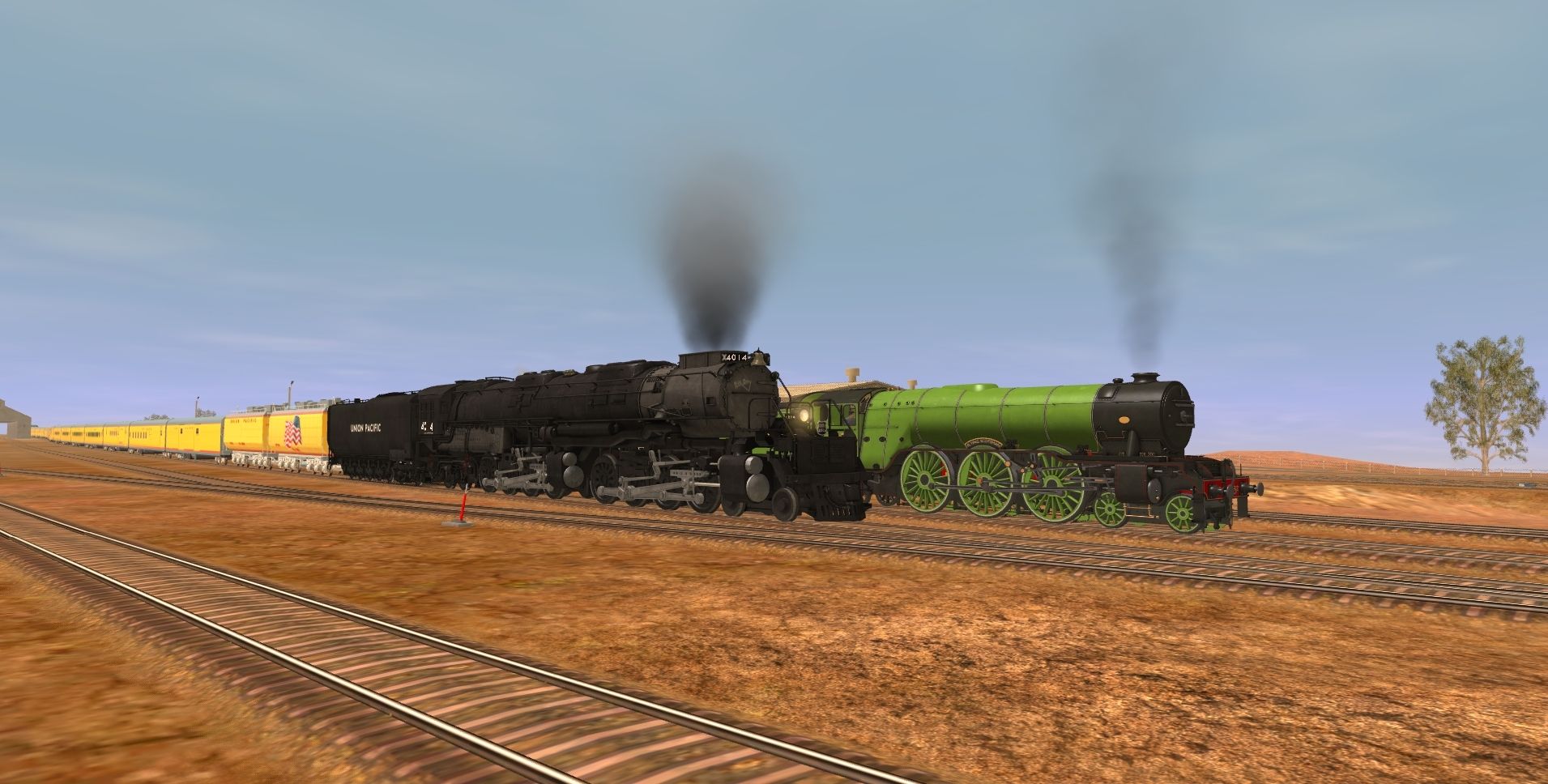 Tags: Trainz: A New Era, Outback Australia, Outback Australia - Default, LNER Gresley A3 Flying Scotsman - McAlpine Era, Union Pacific Big Boy 4014 Engine, SP SD40T-2, LNER Gresley A3 Tender - FS Preserved, Union Pacific Big Boy 4014 Tender, UP Auxiliary Tender 809 (Jim Adams) SR, UP Auxiliary Tender 814 (Joe Jordan) SR, UP_Baggage_5772, UP_Baggage_Dormitory_6002, UP_RPO_5900, 40ft Boxcar UP 01