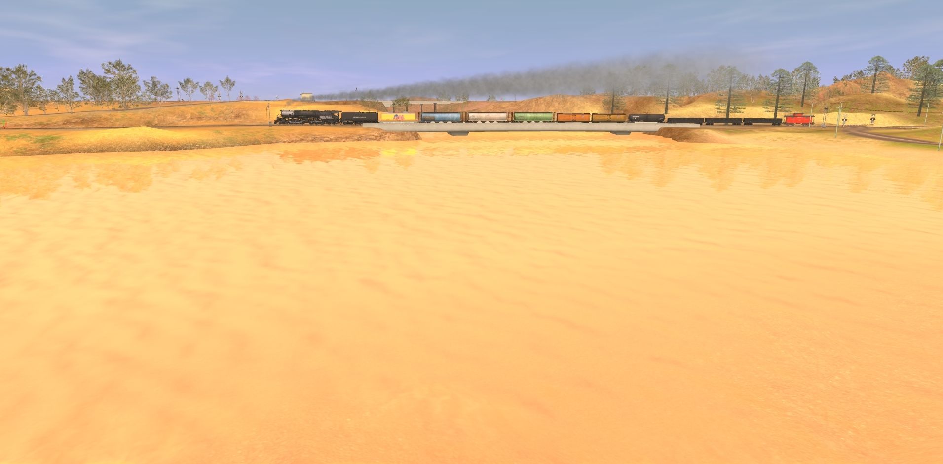 Tags: Trainz: A New Era, Outback Australia, Outback Australia - Default, UPRR Challenger, UPRR Centipede tender coal, UP Auxiliary Tender 809 (Jim Adams) SR, HB Cylindrical Hopper, MWGX (dirty) Cylindrical Hopper, GBCX Cylindrical Hopper, PFE R-40-2 Reefer Late, PFE R-40-2 Reefer Early, TSCX 20800 gal tank car, USRA C Gondola C&O, Caboose Virginian wide