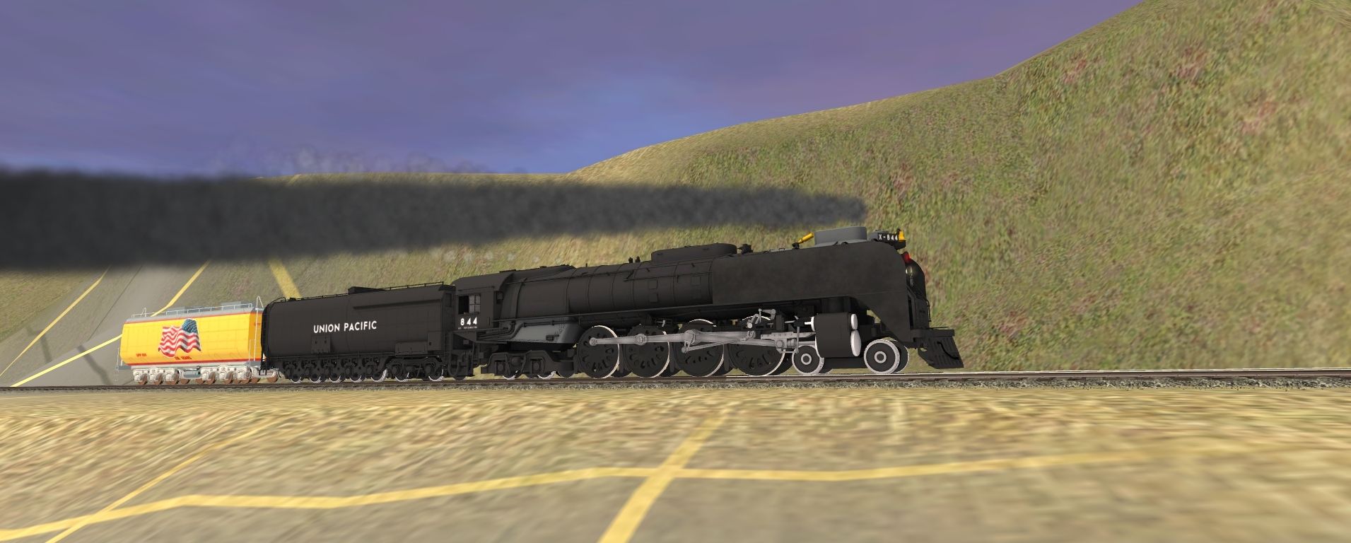 Tags: Trainz: A New Era, Intro to Steam (Modern Day) V2, UPRR FEF-3 844, ATSF C40-8W, UPRR FEF Black oil tender, UP Auxiliary Tender 809 (Jim Adams) SR