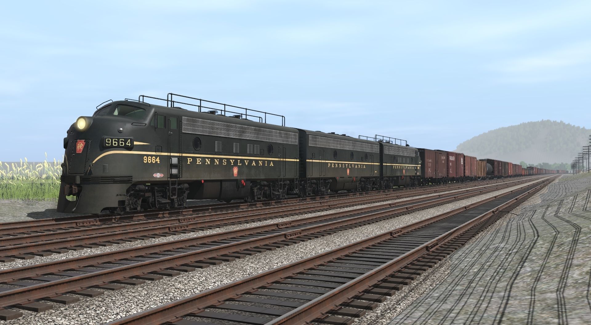 Tags: Trainz Railroad Simulator 2022, Pennsy Lines- Pitts to Philly and More WIP 22d, Default, Flying Cam, PRR F7B Ph 1b, PRR F7A Ph 1b, 40ft Boxcar NKP, 40ft Boxcar WAB Late 1, 40ft Boxcar ACL, 40ft Boxcar Fowler Erie, 38' X-3 Tank Car SHPX, 50' Boxcar NP, 50' Boxcar GTW Late (end doors), 40ft Boxcar WP AAR V8