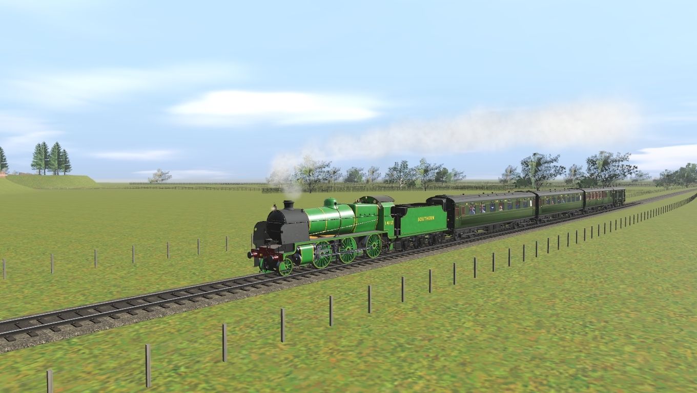 Tags: Trainz Railroad Simulator 2019, LBSCR2, Default, SR Maunsell N Class - Malachite green, SR Maunsell 3500 Gal Tender - Malachite Green, SR Maunsell 59 ft R4 TO Third Open - Olive, SR Maunsell 59 ft R4 BCK Brake Composite (High Window) - Olive, SR Maunsell Van U - Utlity Van - Olive Green