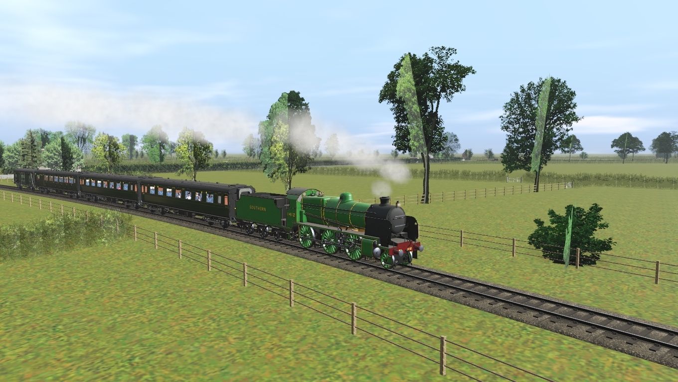 Tags: Trainz Railroad Simulator 2019, LBSCR2, Default, SR Maunsell N Class - Malachite green, SR Maunsell 3500 Gal Tender - Malachite Green, SR Maunsell 59 ft R4 TO Third Open - Olive, SR Maunsell 59 ft R4 BCK Brake Composite (High Window) - Olive, SR Maunsell Van U - Utlity Van - Olive Green