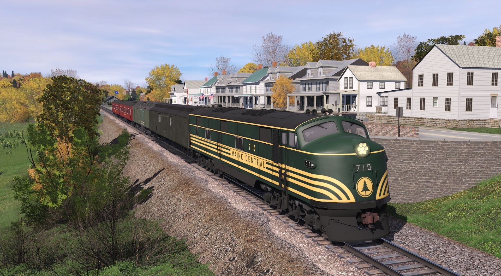 Tags: Trainz Railroad Simulator 2022, Stratton Falls Line, Default, Flying Cam, MEC E7 Green Early, NYC Heavyweight Pullman Baggage car 2, NH Class 2780 Steel RPO-Baggage Combine, B&M American Flyer Coach V2