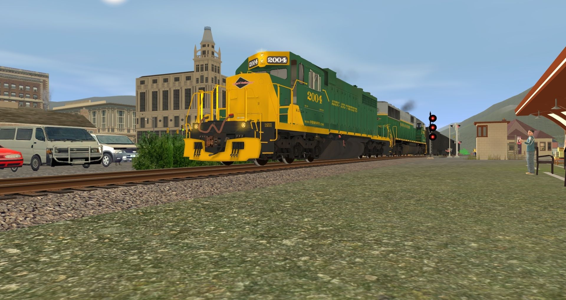 Tags: Trainz: A New Era, READING & NORTHERN, Default, SD38 RBMN #2004, RBMN SD50, Caboose C&O A907 yellow, Caboose C&O A915 red, Bethgon RBMN, PPLX 100 Ton Hopper