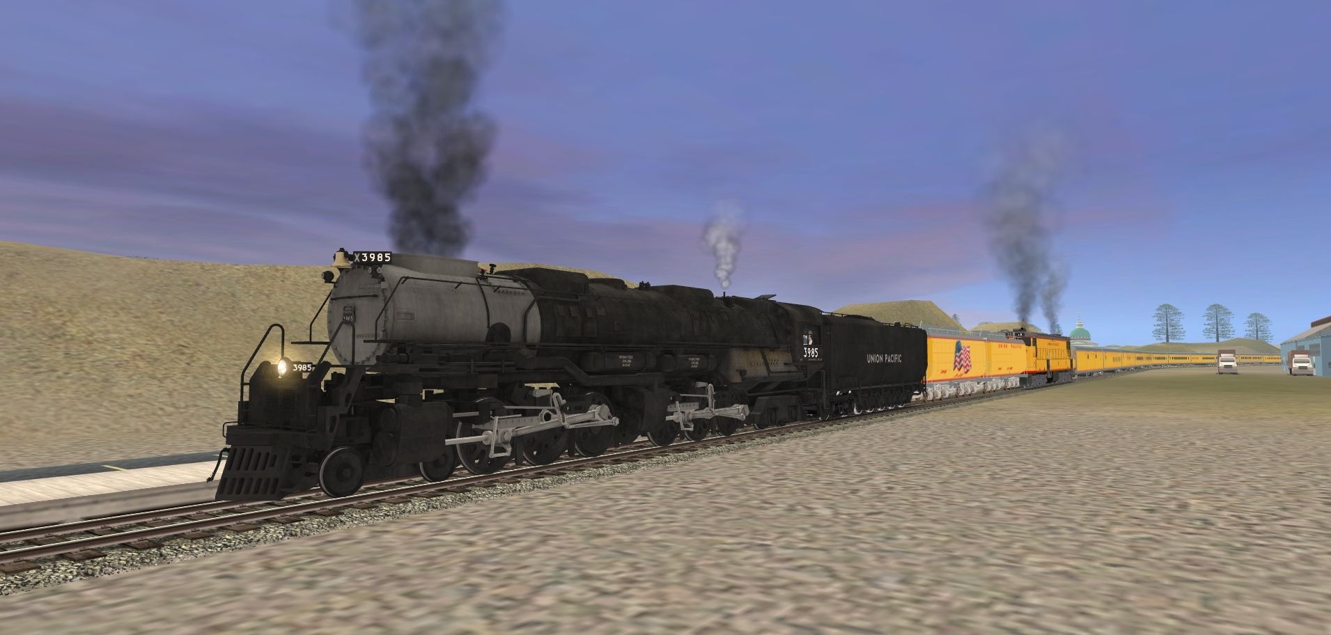 Tags: Trainz: A New Era, Intro to Steam (Modern Day) V2, Intro to Steam (Modern Day) V2 - Default, UP JMB Challenger Weathered, ATSF C30-7, General Electric U50 Union Pacific, SP SW1500, Reading B8a 0-6-0 Camelback, UP JMB Centipede tender oil Clean, UP Auxiliary Tender 809 (Jim Adams) SR, UP Auxiliary Tender 814 (Joe Jordan) SR, IC Airslide Hopper, Flatcar BNSF 60ft #917504 TS12, MWGX (dirty) Cylindrical Hopper