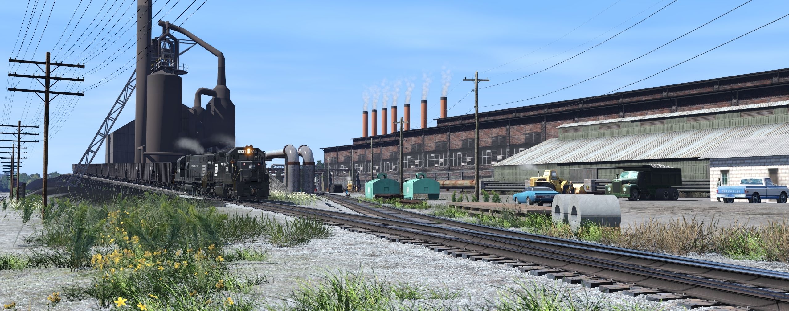 Tags: Trainz Railroad Simulator 2022, EL Mahoning Divison 9-07-23 pre beta ev, Default, PC SD35, PC SD38, PC PD3000, PC 60' X61/X61C Boxcar, PC 50' PS-1, PC 100 Ton Hopper, RDG 60' ACF Boxcar DD XAPc, PC X67 Autoparts Boxcar