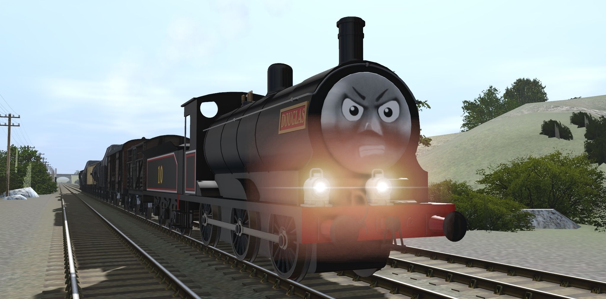 Tags: Trainz Railroad Simulator 2019, Tidmouth Mainline and Edward's Branch, Default, TTTE - Douglas The Scottish Twin Engine 2010, TTTE - Douglas' Tender 2010, Engie's - TVS GWR Cattle Van (TS19), Engie's - TVS SR CCT 8 Wheeled Van Type 1 (TS19), Engie's - TVS 14T Tanker Wagon (Type 1 TS19), Engie's - TVS 10T Saxa Salt Van (TS19), Engie's - TVS S1 7 Plank Wagon (TS19), Engie's - TVS SR 25T Pillbox Brakevan (TS19)