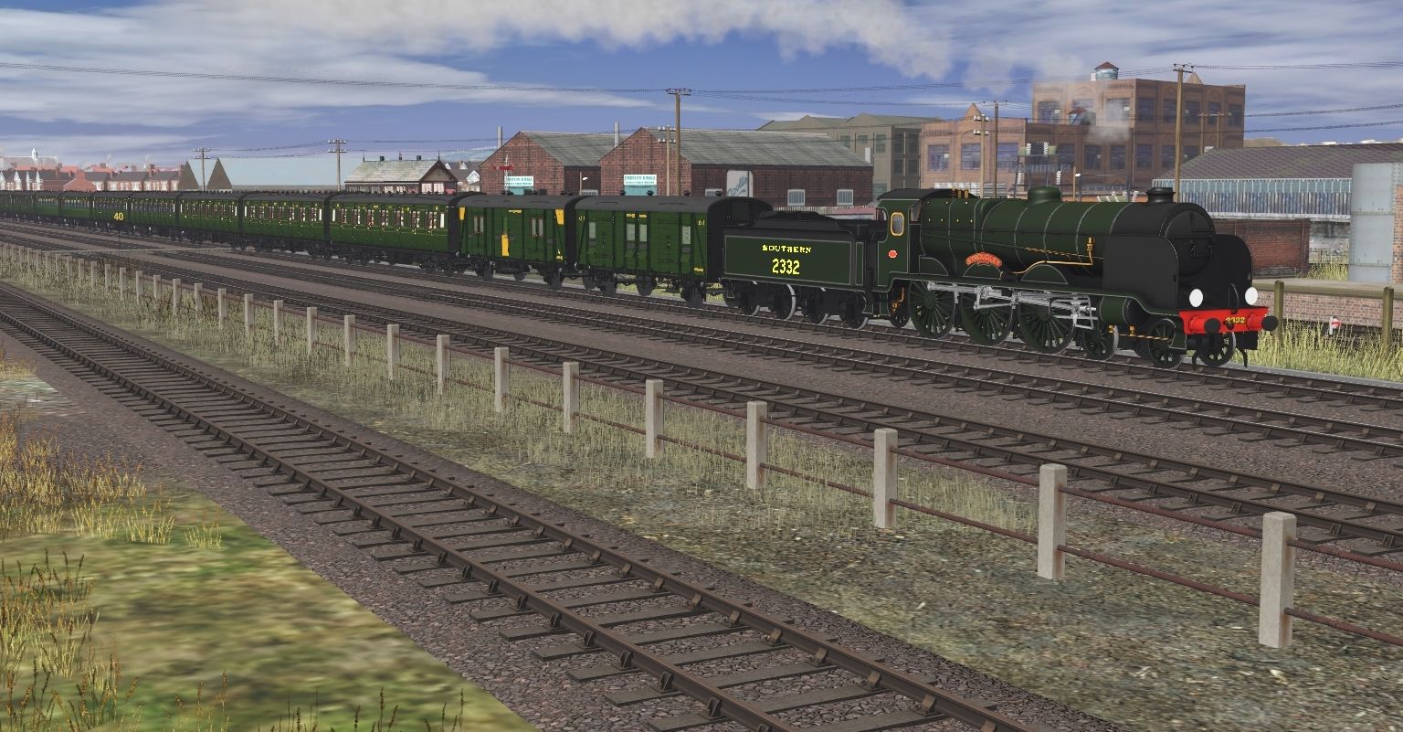Tags: Trainz Railroad Simulator 2019, Dearnby & District : UK 1900's-1910's Mainline Branchline & Narrow Gauge V2.0, LBSCR N15x Maunsell Green, Fury (LMS Crimson), LMS Class G2 0-8-0 (Super D) Weathered, LBSCR N15x Maunsell Green Tender, SR Maunsell PLV - Passenger Luggage Van - Olive Green, SR Maunsell Van C - Passenger Brake Van - Olive Green w. Stove, SR Maunsell 59 ft R4 FK First (Low Window) - Olive, SR Maunsell 59 ft R4 TK Third (Low Window) - Olive, SR Maunsell 59 ft R4 TO Third Open - Olive, SR Maunsell 59 ft R4 CK Composite (Low Window) - Olive, SR Maunsell 59 ft R4 BTK Brake Third 4 compt. (Low Window) - Olive