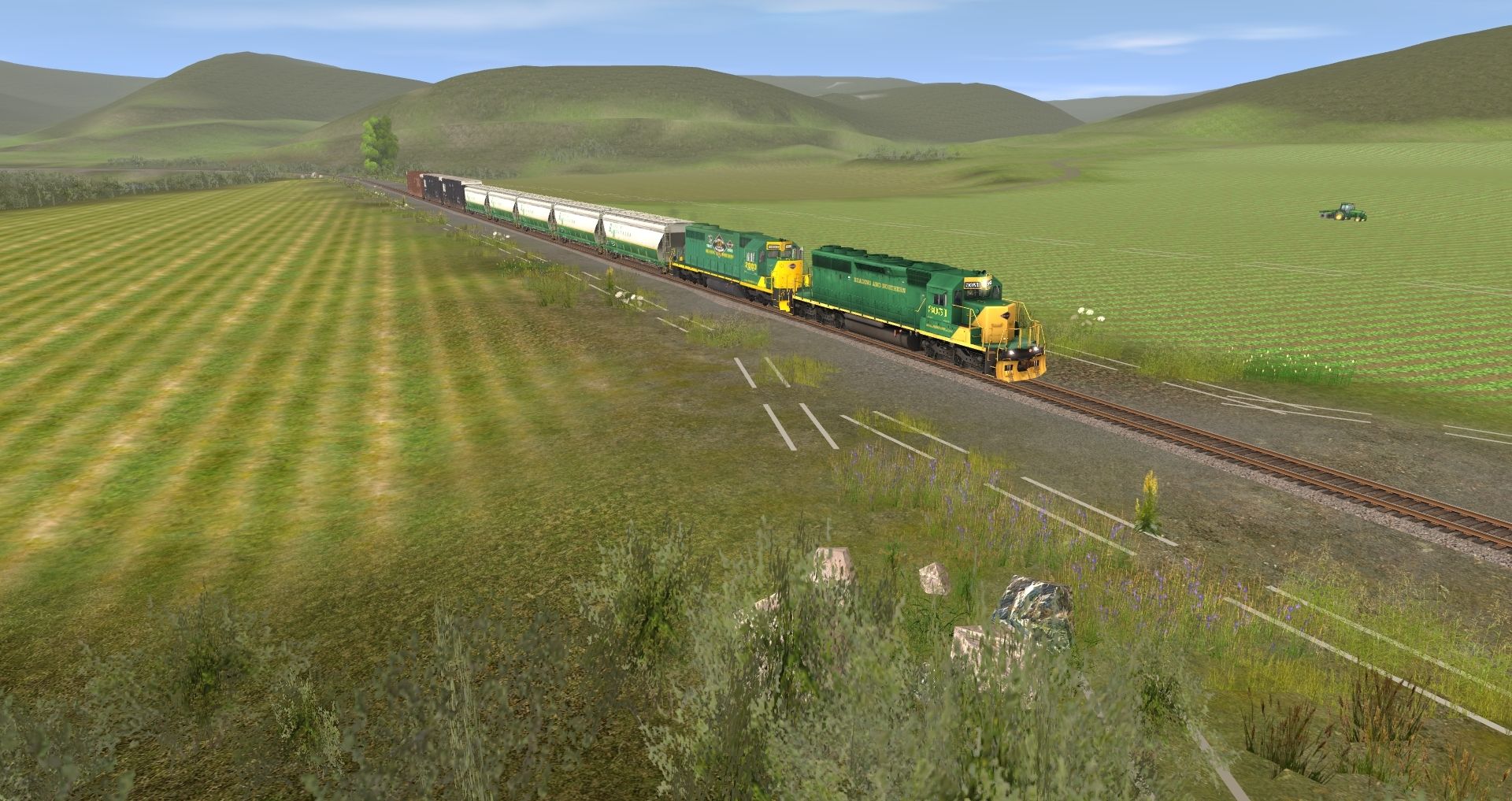 Tags: Trainz: A New Era, READING & NORTHERN, Default, RBMN SD40-2, SD38 RBMN #2003, RBMN ACF Centerflow 3 Bay, NW 60ft Boxcar PS [Black] (Autoparts), NW 60ft Boxcar PS [Brown] (Autoparts)