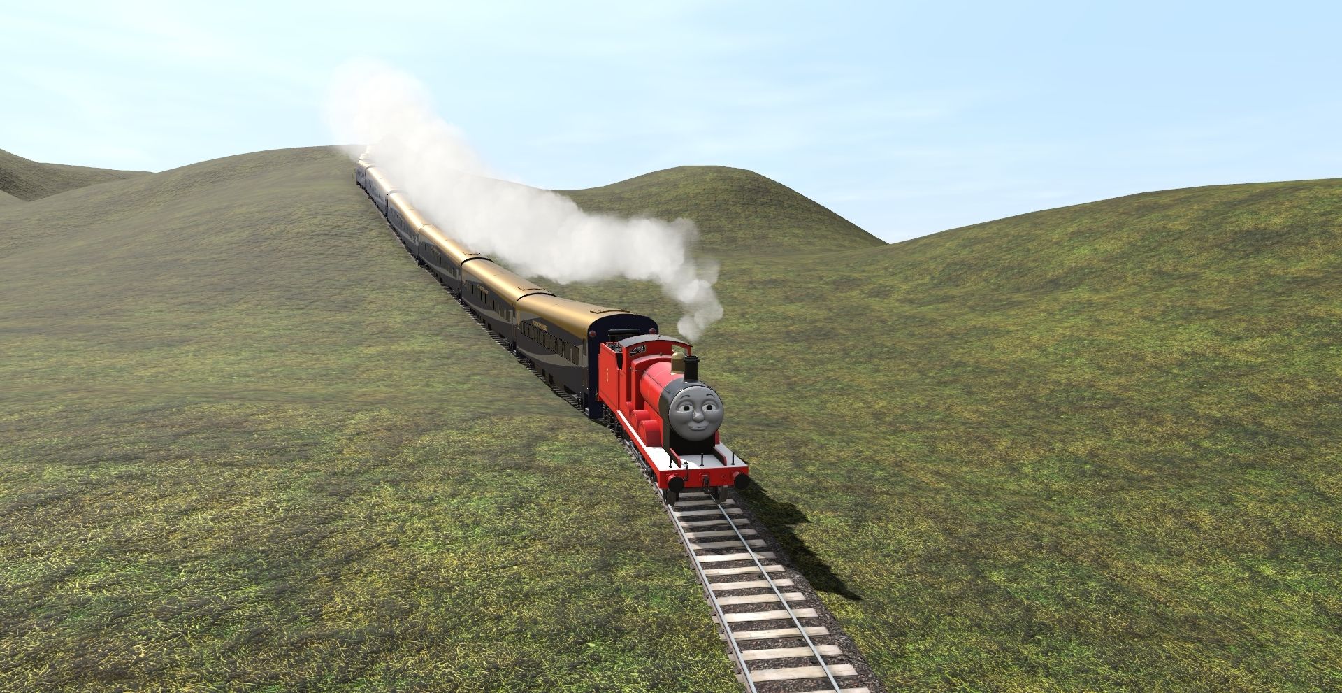 Tags: Trainz Railroad Simulator 2019, docks and hills, Default, TTTE - James the red engine (Reskin Friendly), TTTE - James's Tender (Reskin Friendly), RMRX 'Red Leaf' Coach