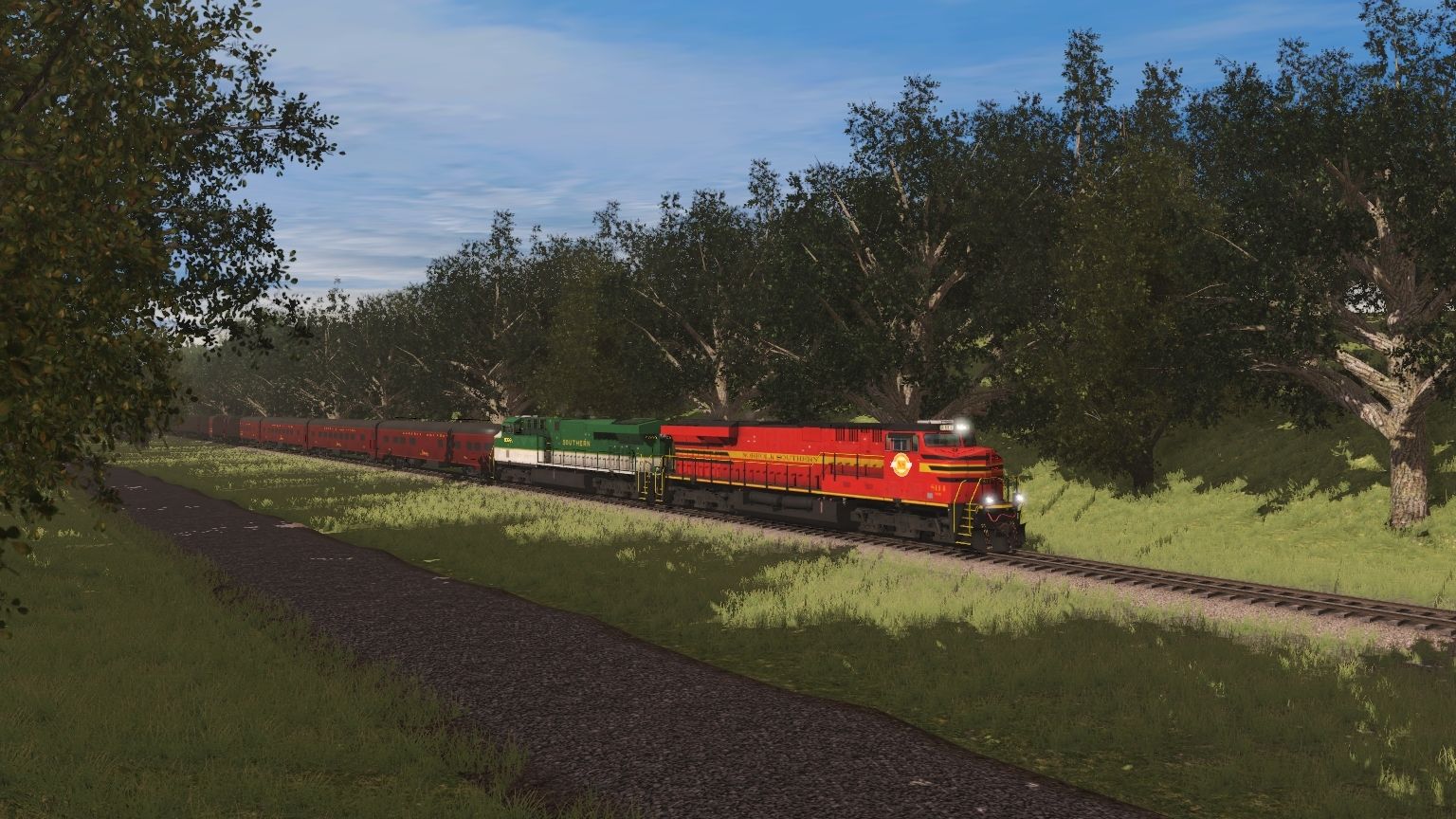 Tags: Trainz Railroad Simulator 2019, Aragon & Southern, NS ES44AC NS Heritage 8114, NS ES44AC SOU Heritage 8099, N&W NS Powhatan Arrow 07 P4 Observation Lounge 581, NS 29 Powhatan Arrow, NS 28 Powhatan Arrow, N&W NS Powhatan Arrow 01 P1 Locker Car 502, N&W NS Powhatan Arrow 02 P2 Divided Coach 511, N&W NS Powhatan Arrow 03 P3 Standard Coach 535, N&W NS Powhatan Arrow 04 P3 Standard Coach 537, N&W NS Powhatan Arrow 05 P3 Standard Coach 538, N&W NS Powhatan Arrow 06 D1 Diner 492