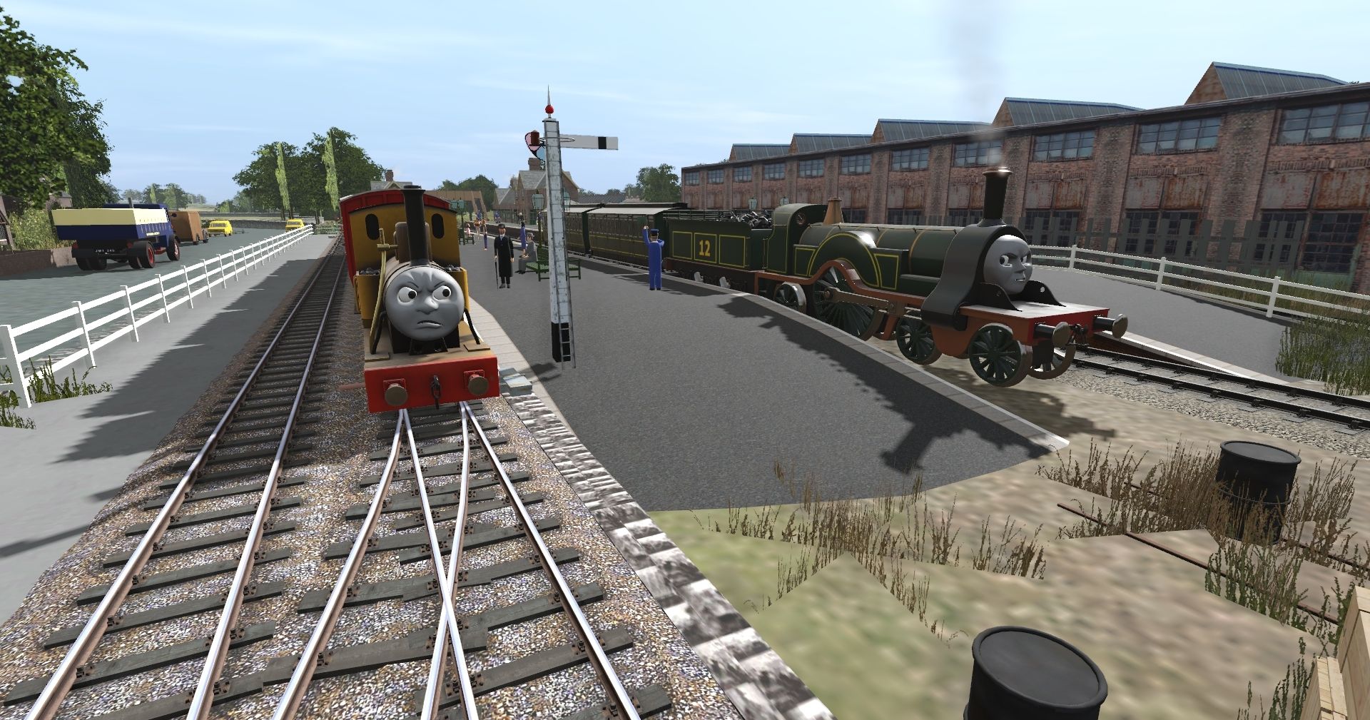 Tags: Trainz Railroad Simulator 2019, Rws Crovan's Gate, Default, Flying Cam PBR, S4 - Duncan the Grumpy Engine, TSI - Emily The Emerald Engine, TSI - Emily's Tender, SF - Emily's Composite Coach, S4 - Red Narrow Gauge Coach, SF - Emily's Brake Coach, S4 - Brakevan (Narrow Gauge)