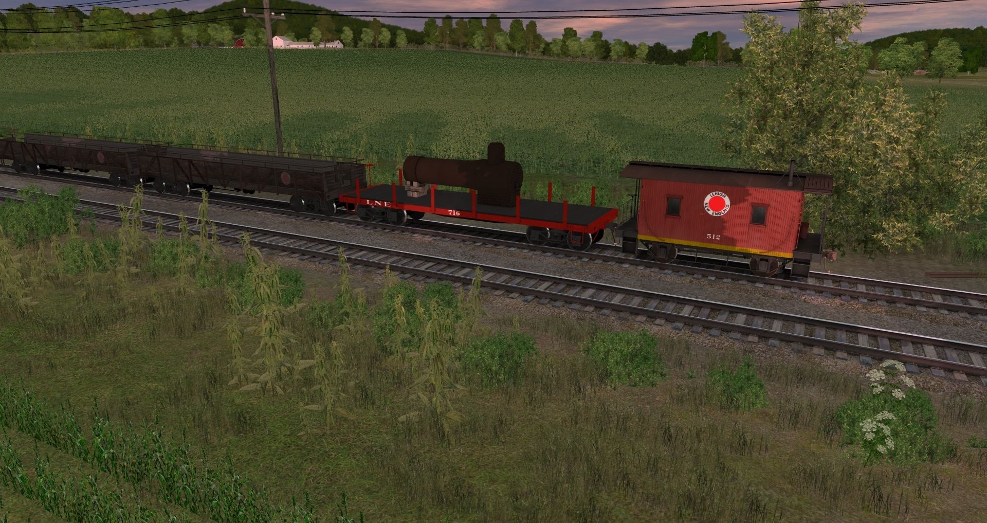 Tags: Trainz: A New Era, Wanamaker Kempton & Southern ORIGINAL, WK&S 65 Engine, WK&S GE 44 Tonner 734, Generic Industrial 45 Tonner Yellow PH1, WK&S 512 Bobber Caboose, WK&S Flat Car, WK&S Deadline Open Air Gondola, RDG Archroof Coach, RDG NMn Caboose V1, B&O 50' PS-1, RDG Archroof Combine 2-Tone, DL&W Boonton Coach V1