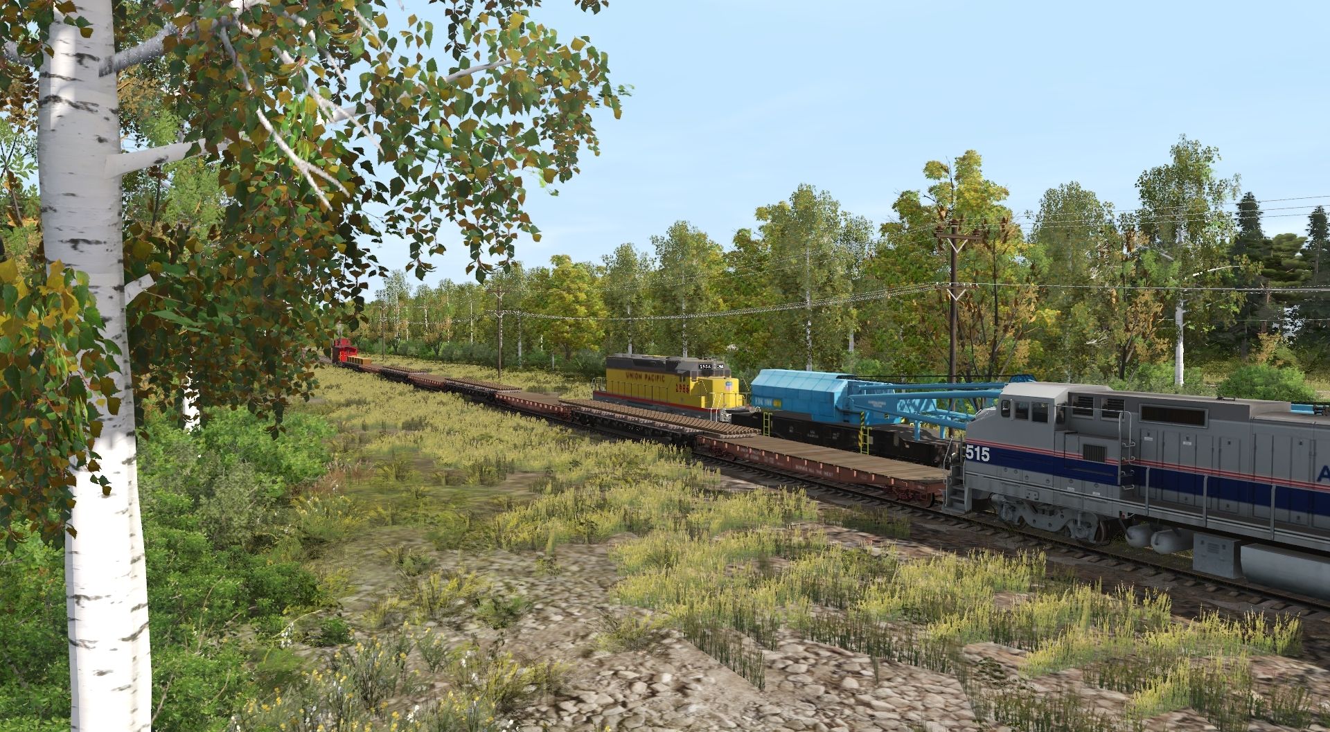Tags: Trainz Railroad Simulator 2022, Demo Realistc Route, Default, Amtrak P32-8BWH Ph IV, Amtrak MOW crane truck, TUME-71402177-SD40-2-UP, V crane EDK1000wagon, 50ft up flatcar, V crane EDK1000_1, 50ton AAR Flatcar CP, CP Caboose 437087