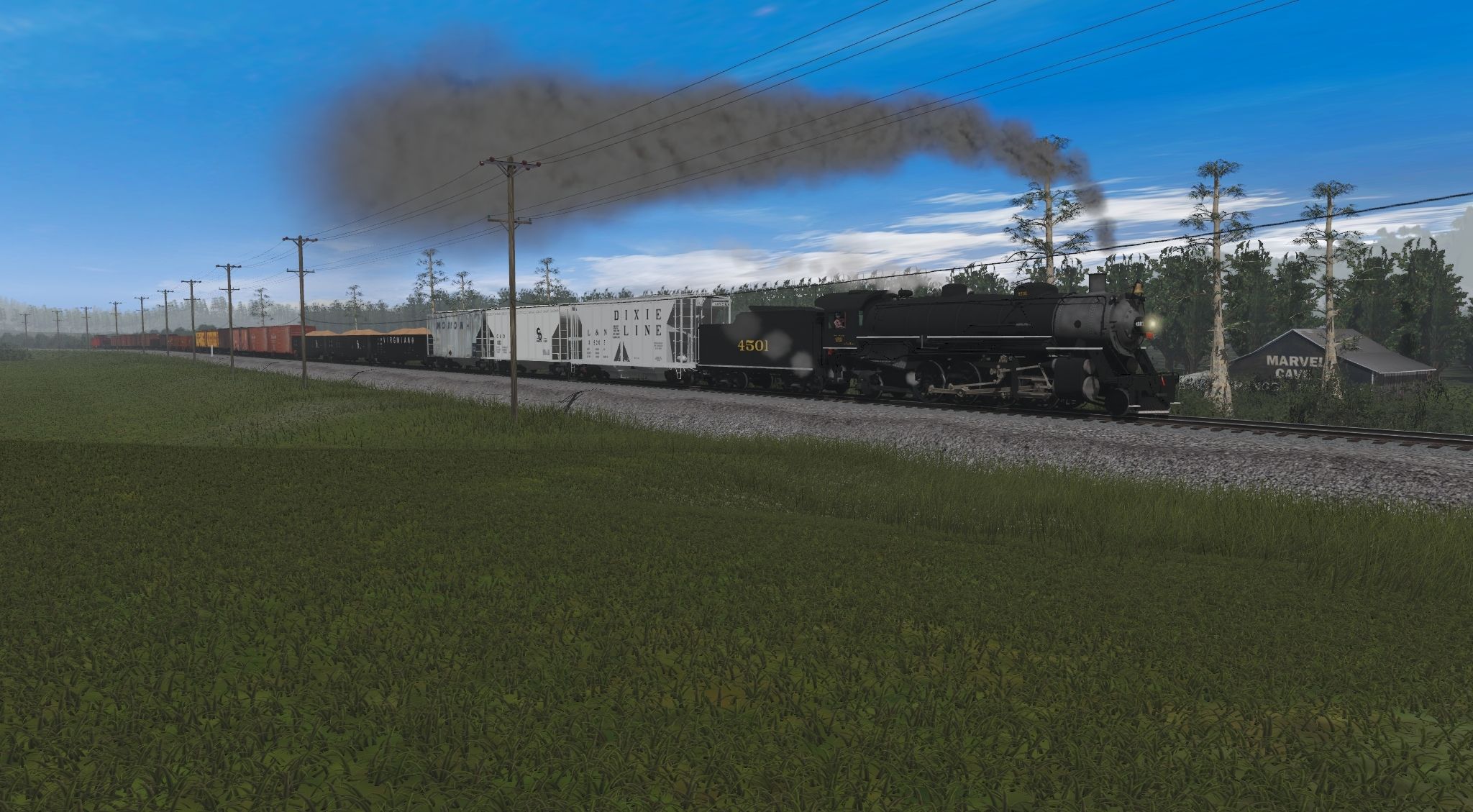 Tags: Trainz Railroad Simulator 2019, Southeastern Coastal Transportation, Default, SOU Ms Class 2-8-2 4501 (Black), SOU Ms Class 2-8-2 Tender 4501 (Black), 2Bay ACF CovHopper L&N Dixie Line #, LO C&O 2-bay 10 hatch 833, 2-bay Covered hopper Monon 220032, GB Gondola Virginian 30089ant, GB Gondola C&O 39390 ex-B&O, 40ft Boxcar NC&StL 01, 40ft Boxcar SBD 772194, 40ft Boxcar ACL, Reefer ACF 40 ft Old Dutch and Cudahys DES