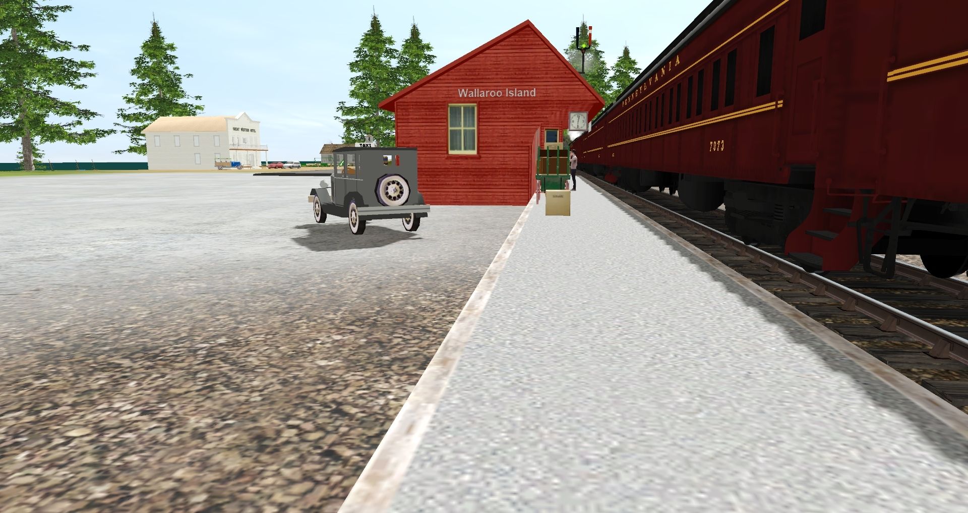 Tags: Trainz Railroad Simulator 2019, Kangaroo Village Railway, Default, CN X10a Engine V1, PRR D78 Diner Postwar, PRR P70 Coach Postwar, PRR Z74 Observation Postwar, PRR PB70 Combine Postwar, PRR BM70NB RPO, PRR B70 Baggage Postwar